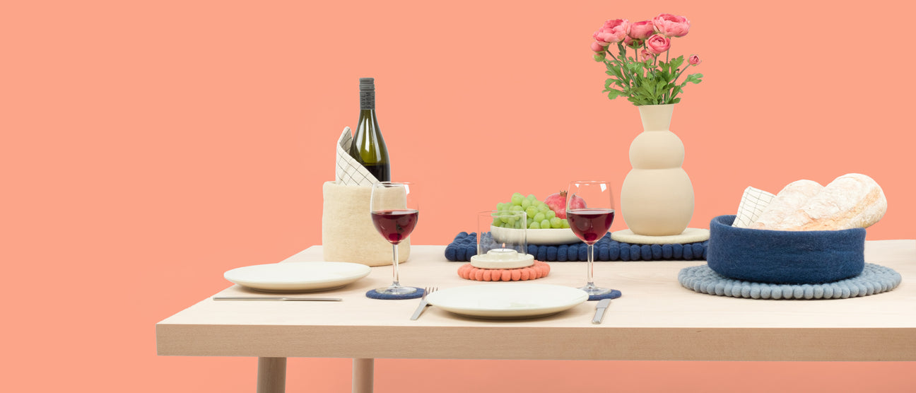 Small accessories from myfelt subtly shape the atmosphere of the dining room. The high-quality pot and glass coasters in many different variations not only bring colour to the table, but also prove to be particularly functional and durable. myfelt coasters are made of pure virgin wool and thus protect sensitive surfaces such as wood and glass from stains and scratches.