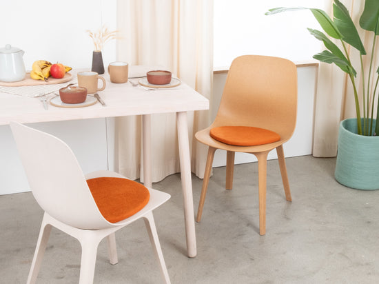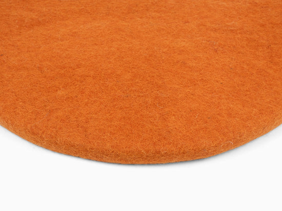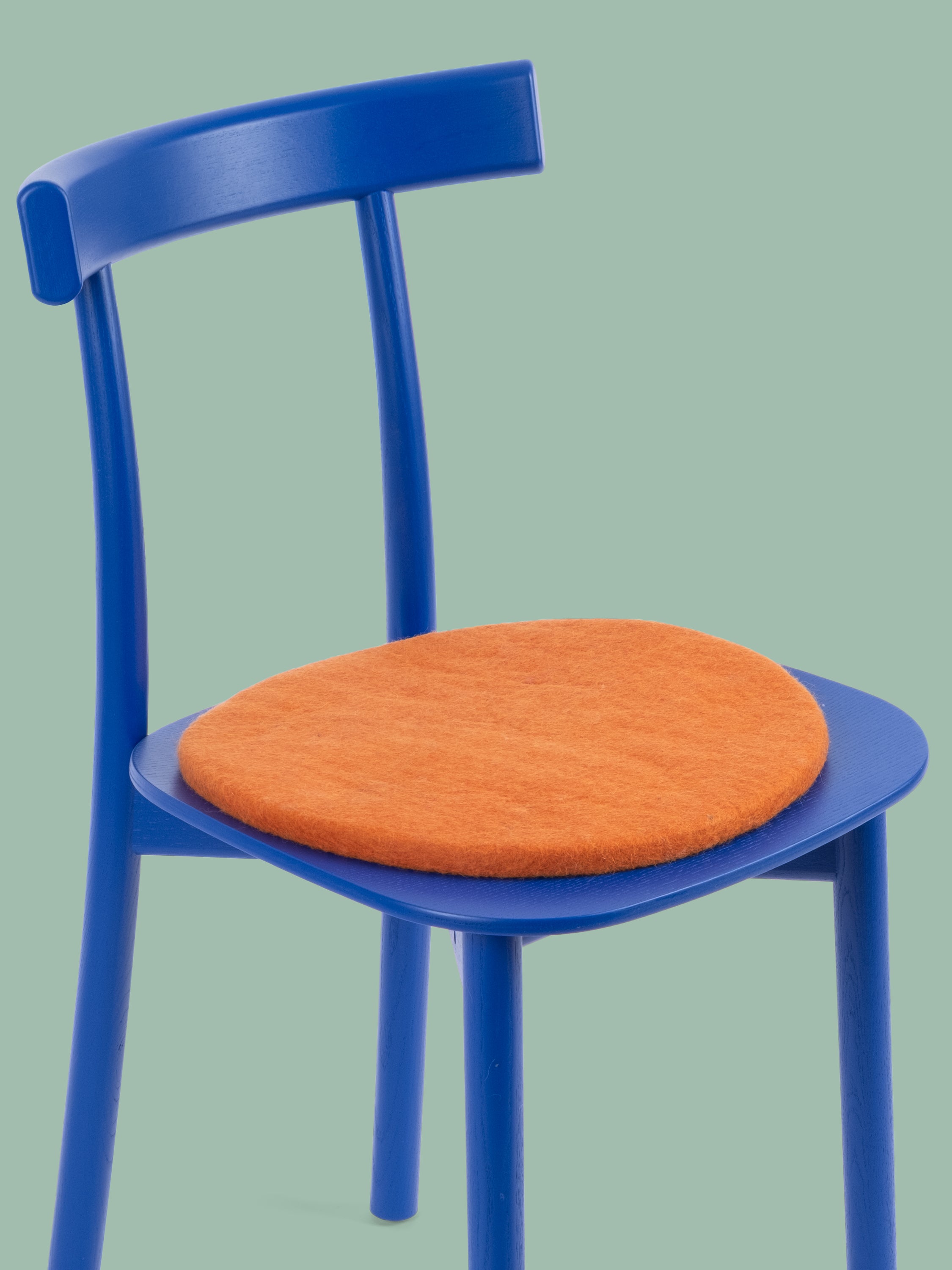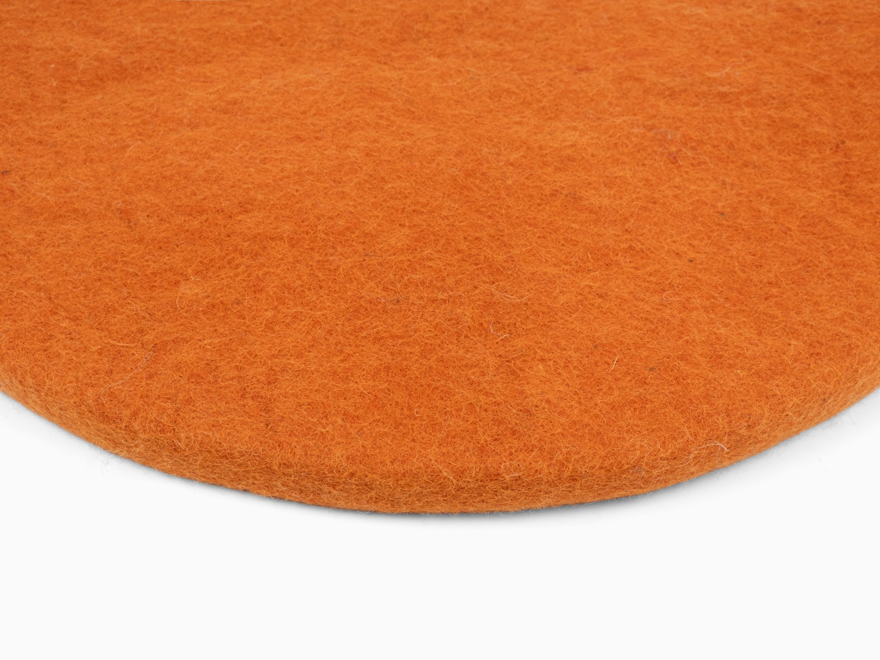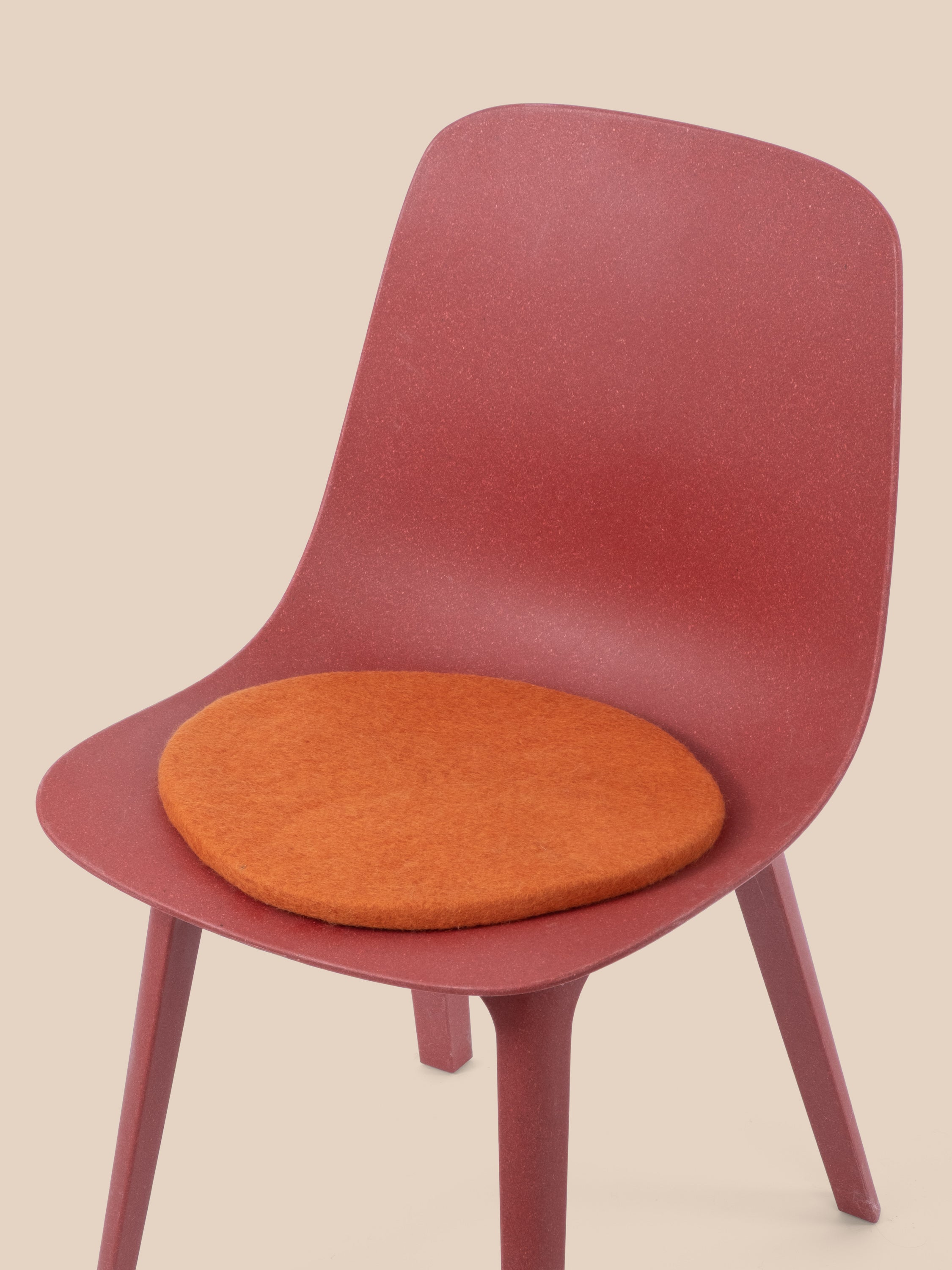 The orange-colored, flat seat pad Afra brings warmth and softness to your favorite chair. Made from pure new wool, handcrafted in Nepal and produced under fair conditions. myfelt seat pads are water- and dirt-repellent and can be used on both sides.