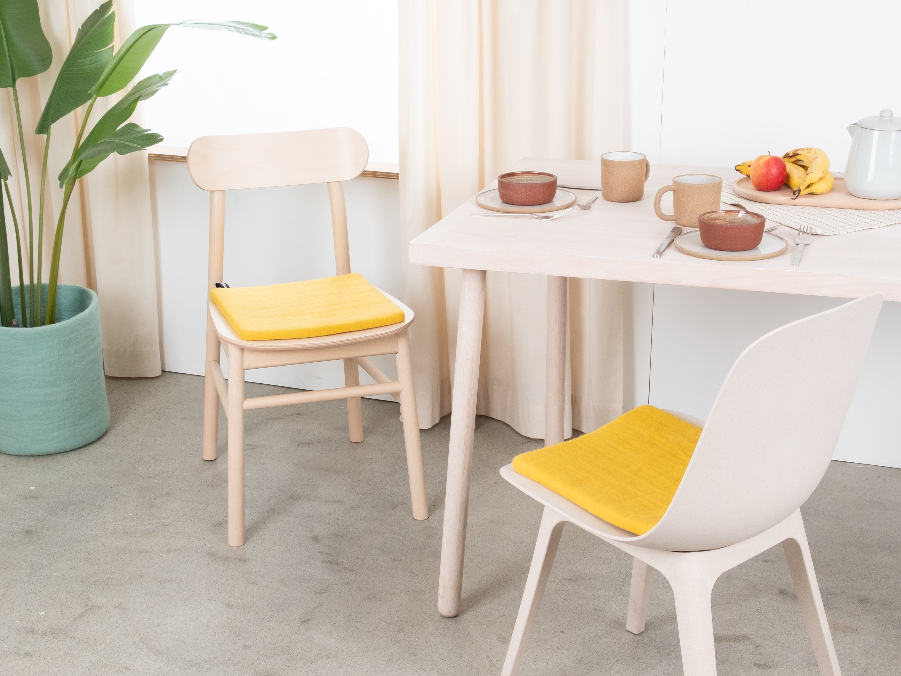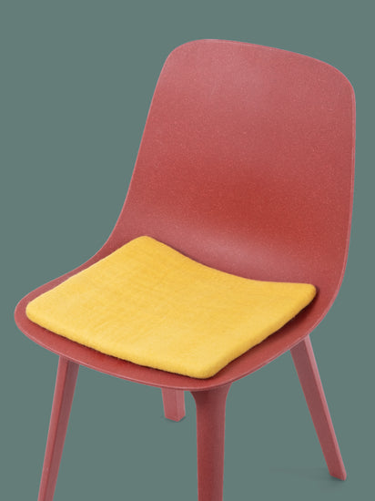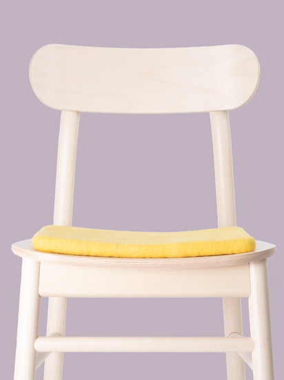 The yellow, flat seat pad Kira brings warmth and softness to your favorite chair. Made from pure new wool, handcrafted in Nepal and produced under fair conditions. myfelt seat pads are water- and dirt-repellent and can be used on both sides.