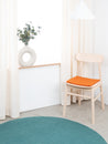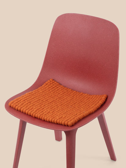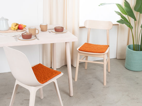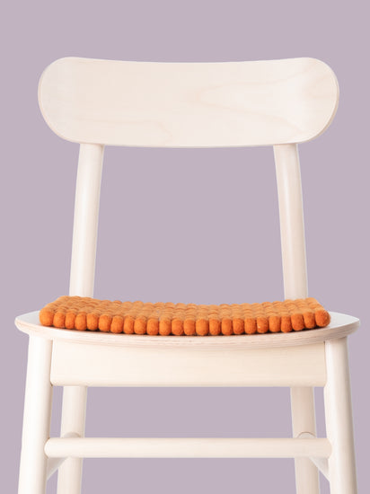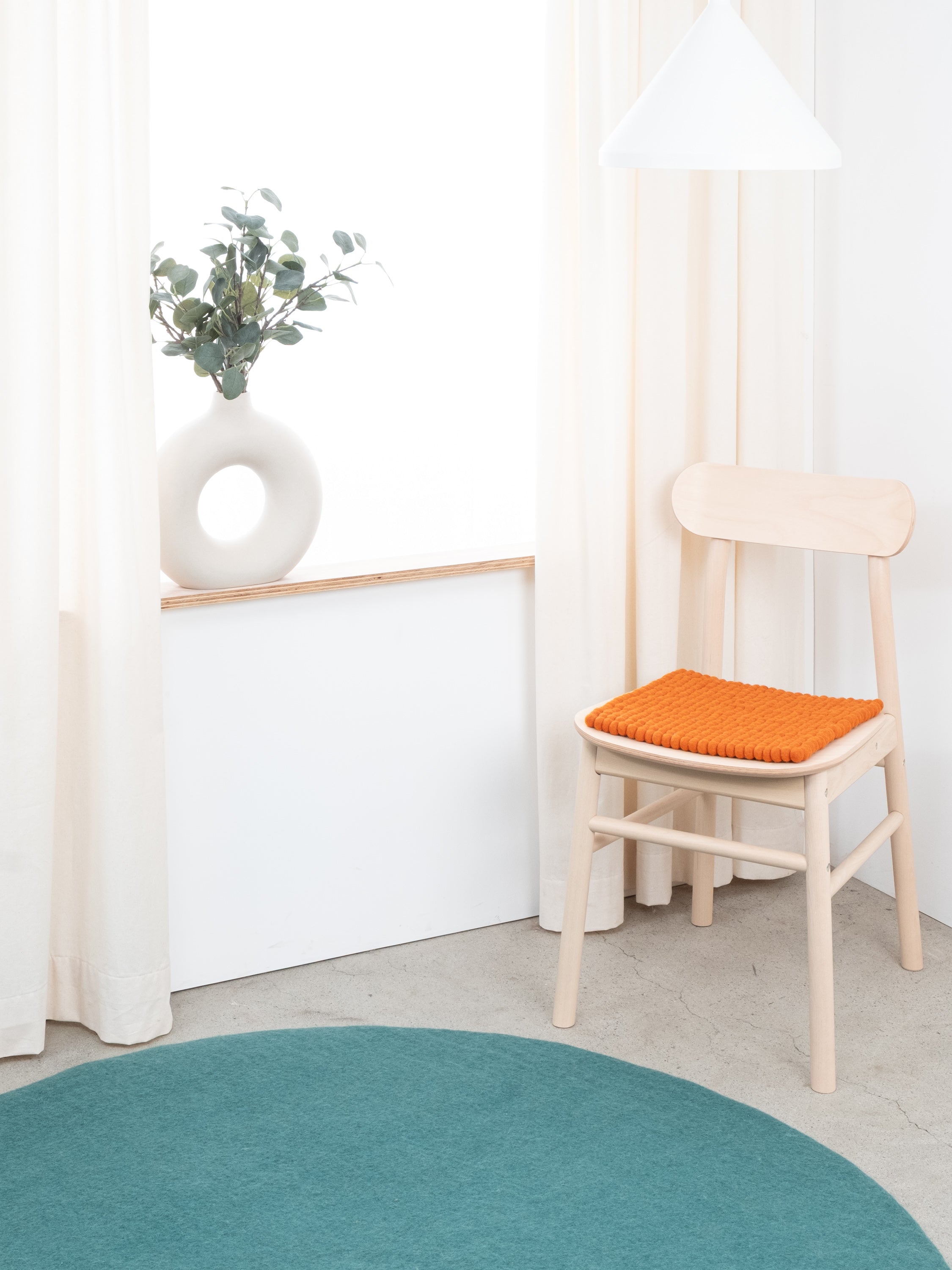 The orange-colored seat pad Afra brings warmth and softness to your favorite chair. Made from pure new wool, handcrafted in Nepal and produced under fair conditions. myfelt seat pads are water- and dirt-repellent and can be used on both sides.
