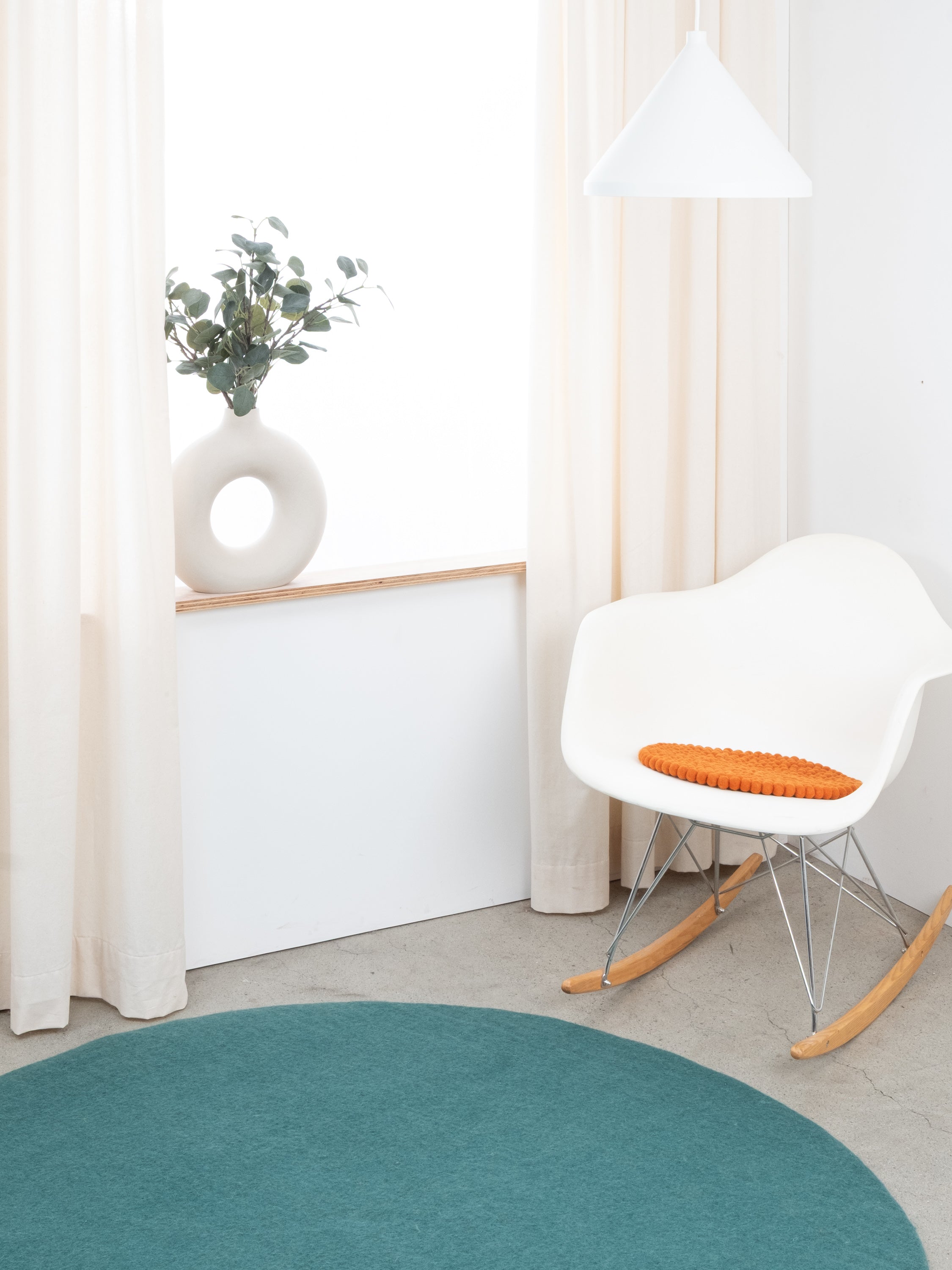 The orange-colored seat pad Afra brings warmth and softness to your favorite chair. Made from pure new wool, handcrafted in Nepal and produced under fair conditions. myfelt seat pads are water- and dirt-repellent and can be used on both sides.