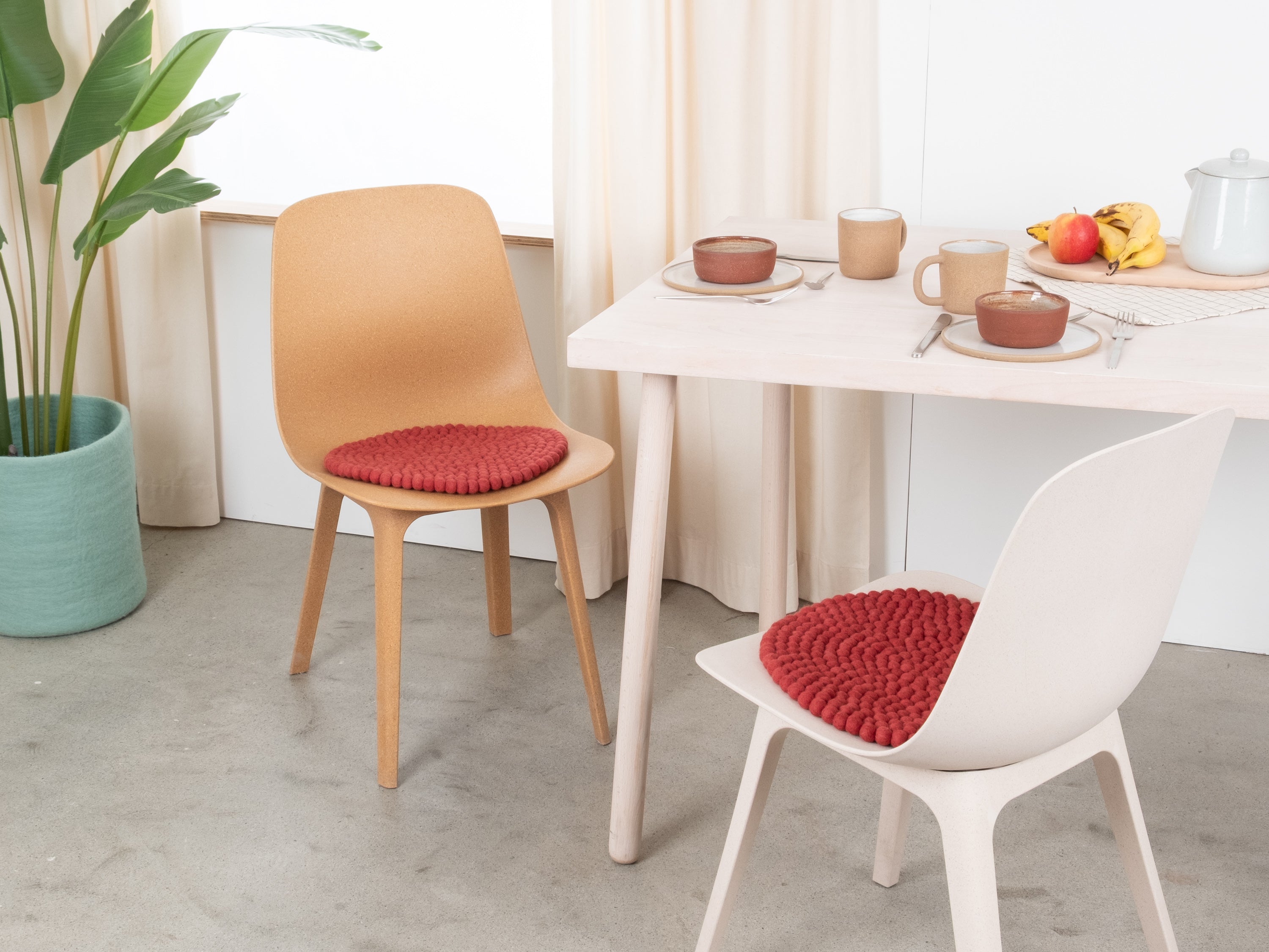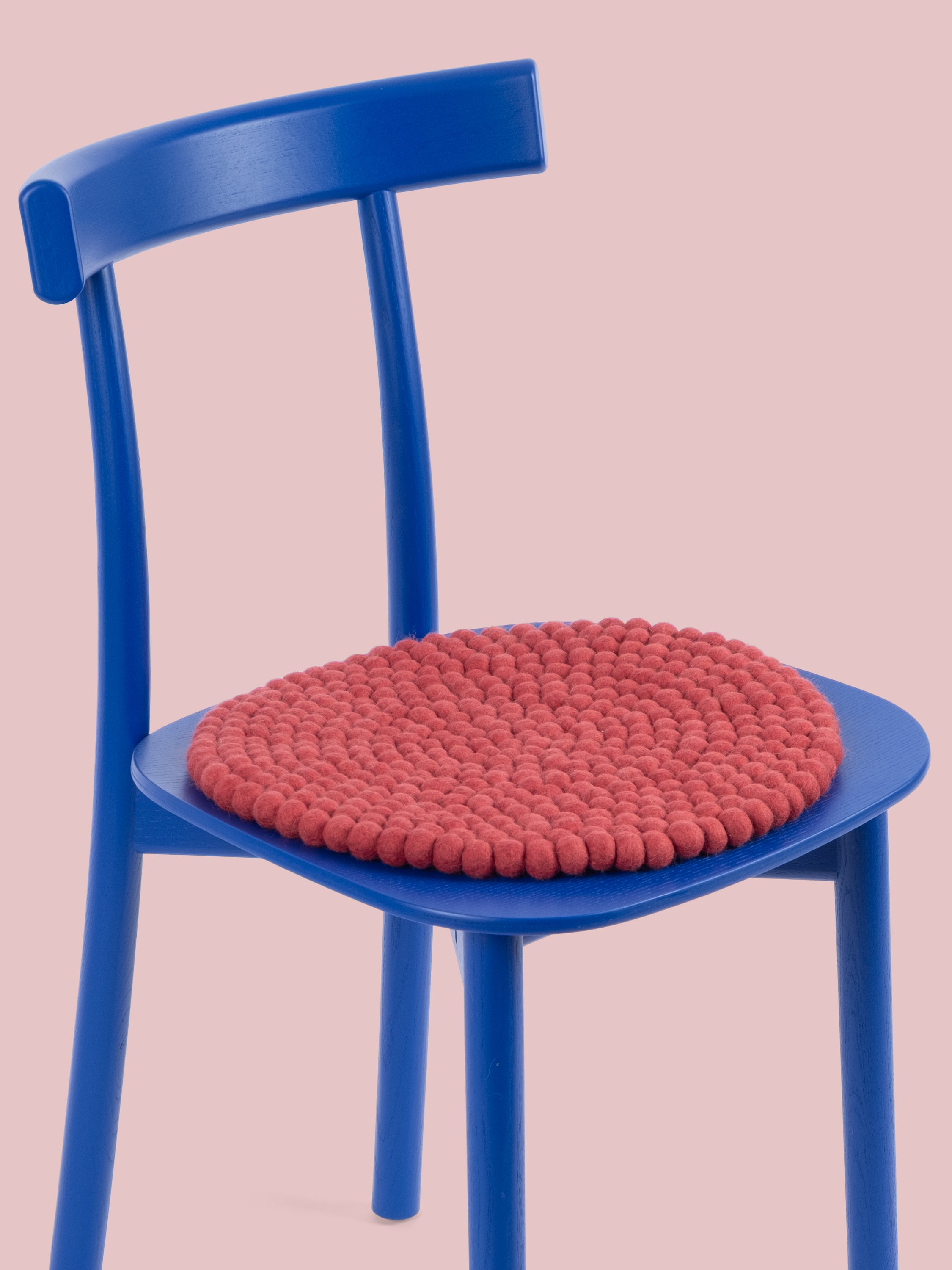 The wine red seat pad Kaja brings warmth and softness to your favorite chair. Made from pure new wool, handcrafted in Nepal and produced under fair conditions. myfelt seat pads are water- and dirt-repellent and can be used on both sides.