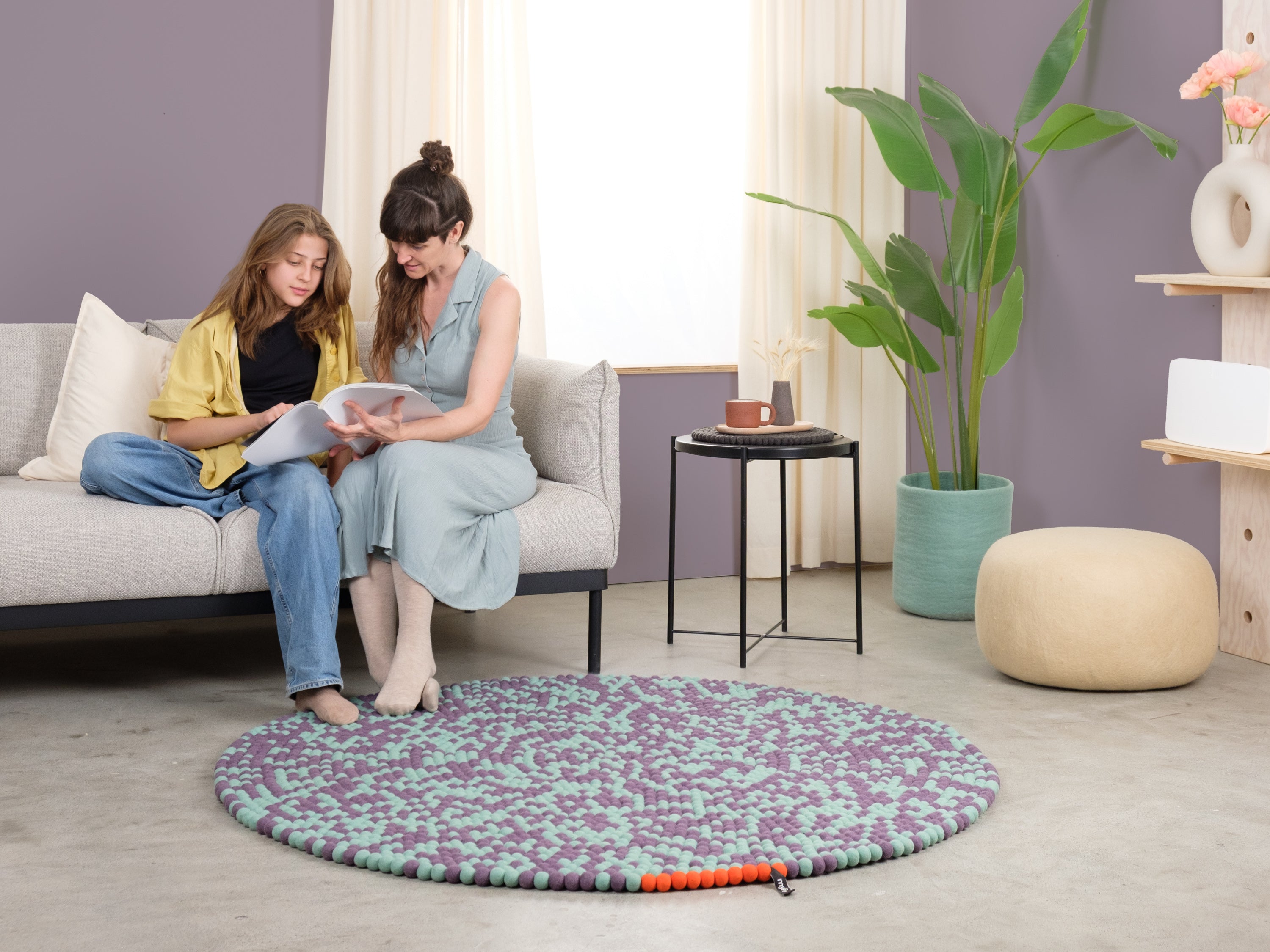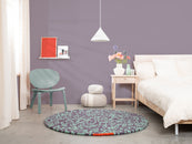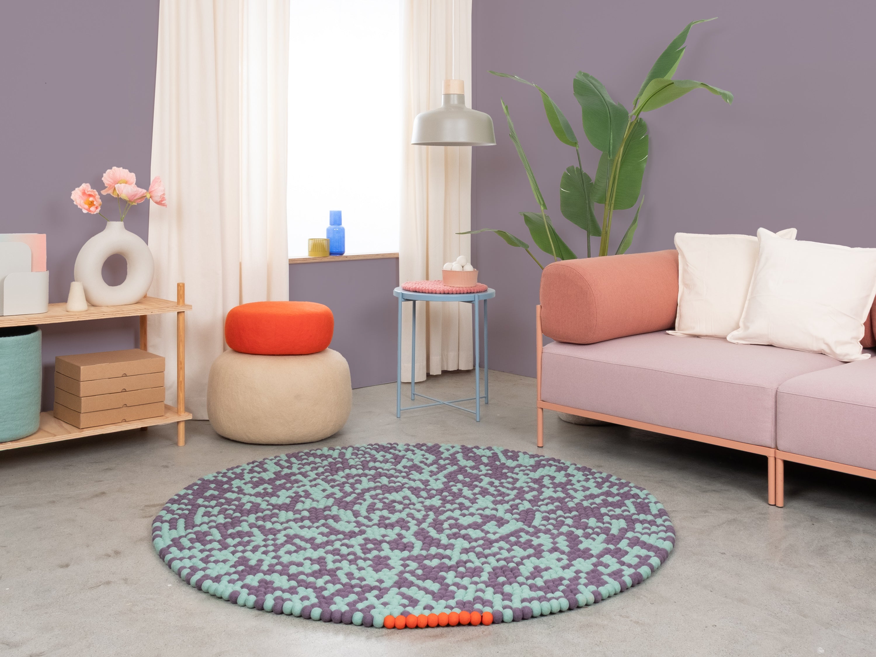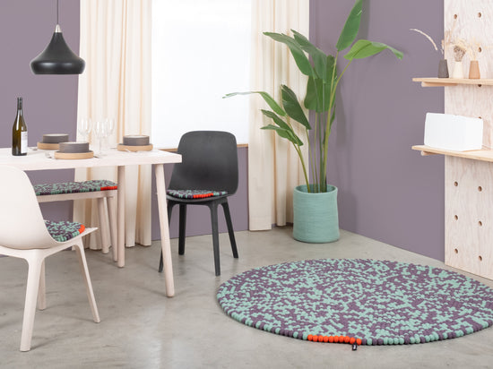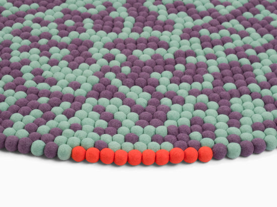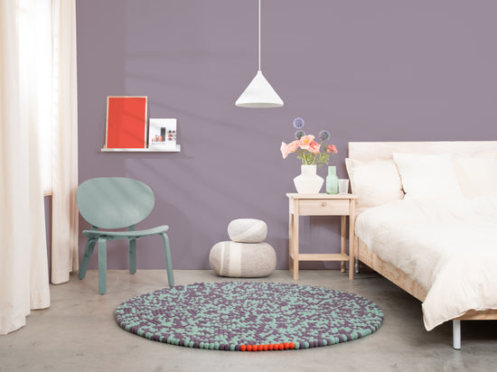 Sage green and plum violet: two tones creating movement. Clear. Cool. Open. A felt ball rug that lets rooms breathe. Robust, colorfast, and naturally dirt-repellent – ball by ball.