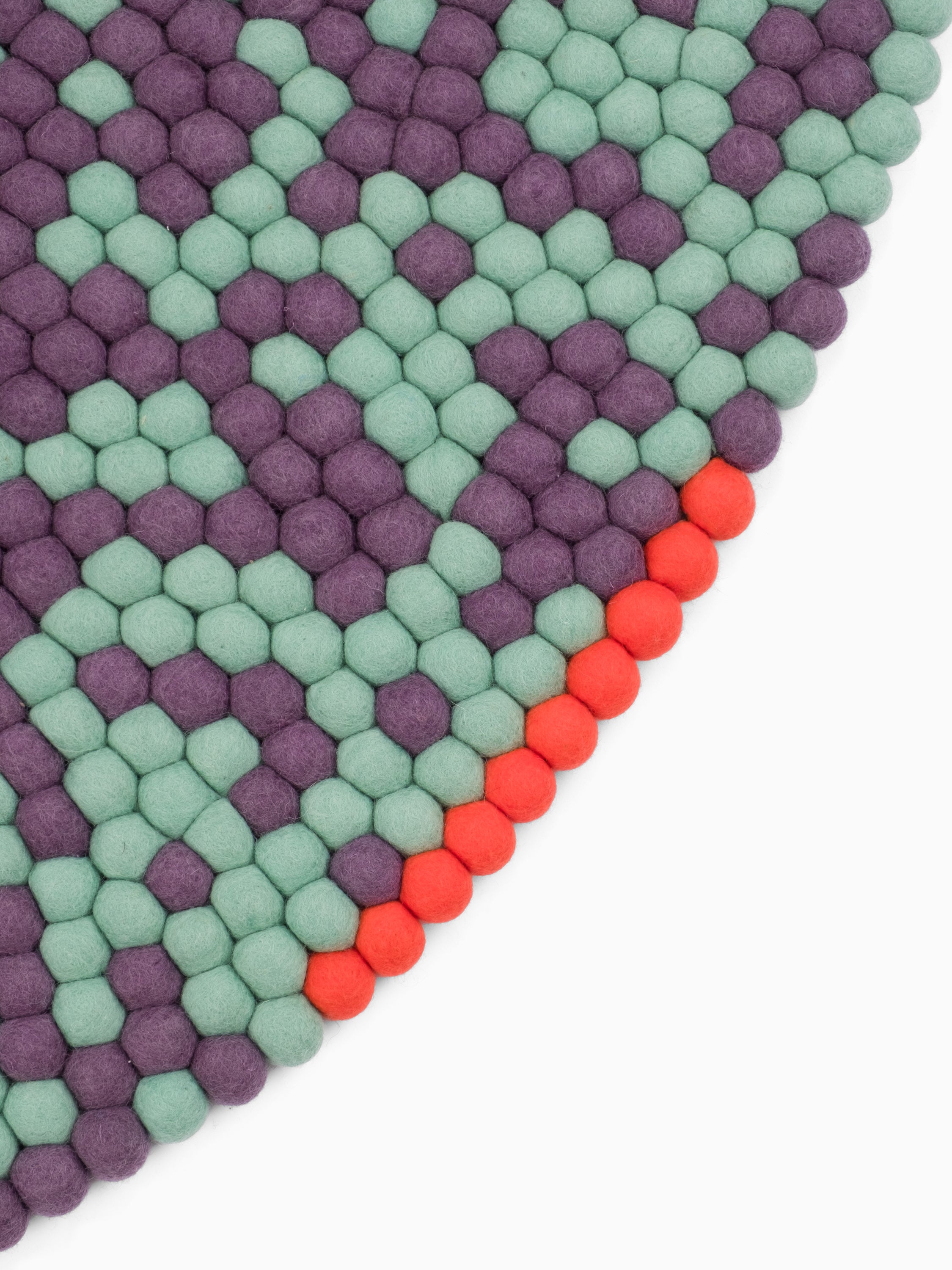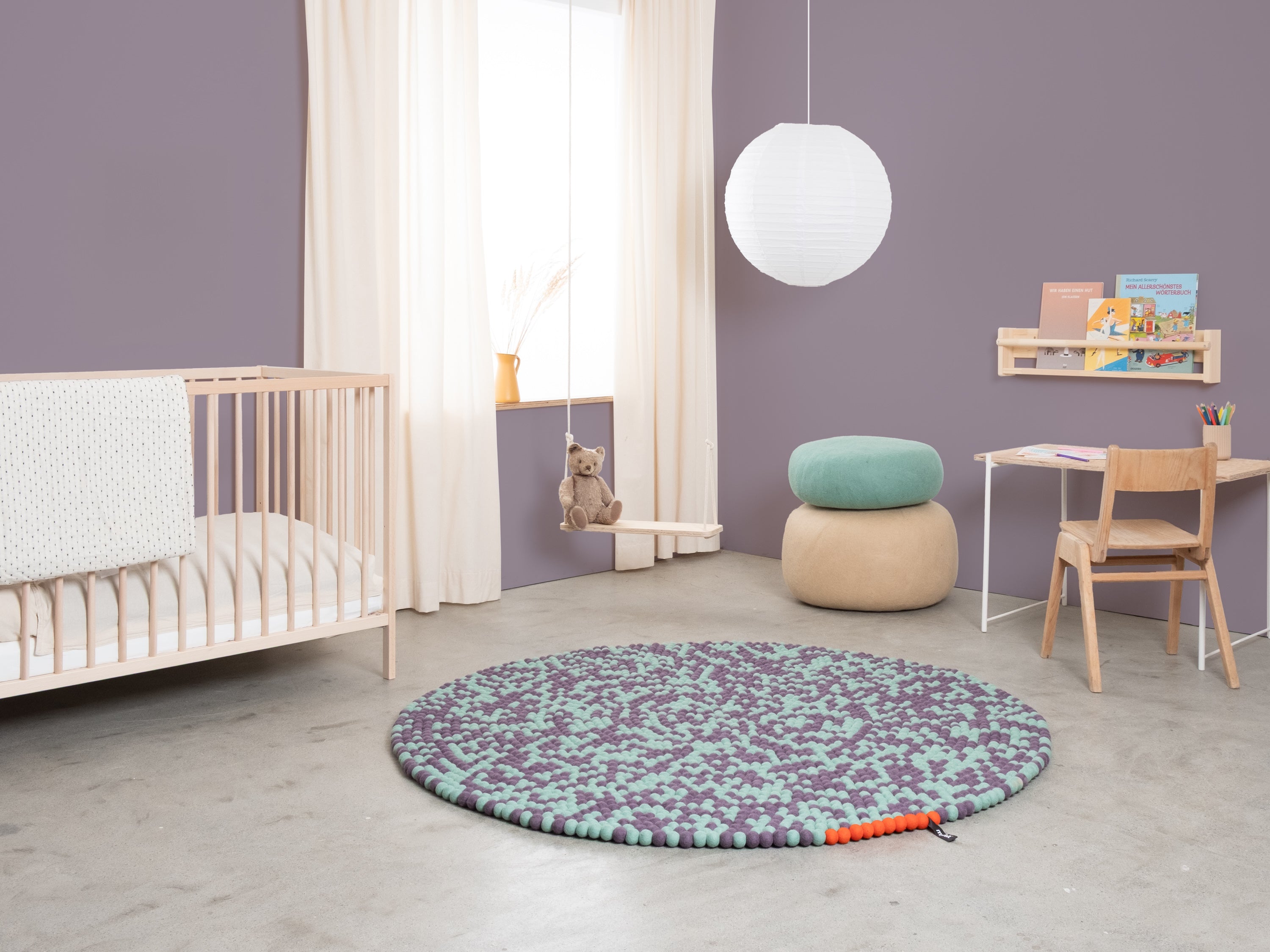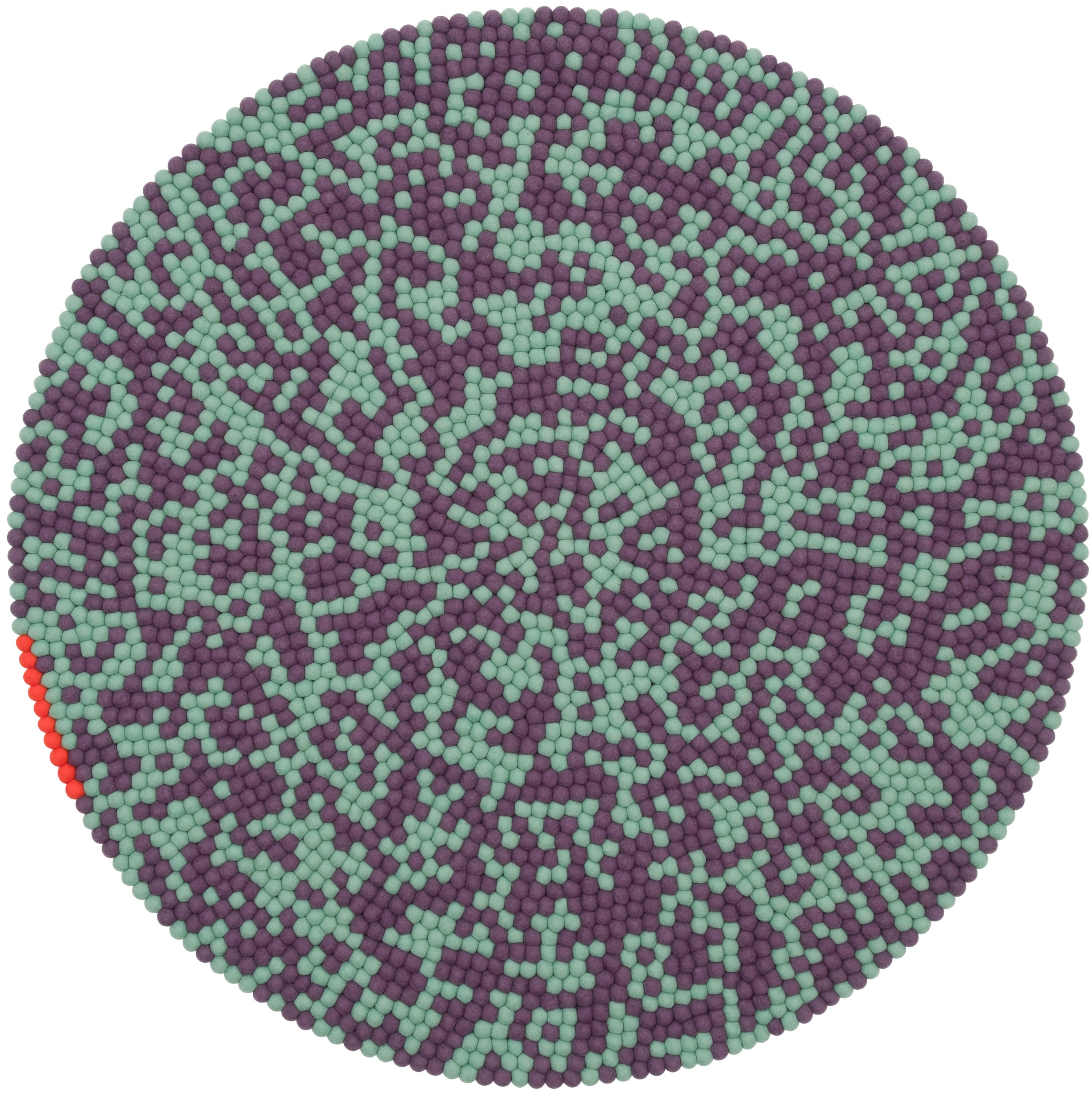 Sage green and plum violet: two tones creating movement. Clear. Cool. Open. A felt ball rug that lets rooms breathe. Robust, colorfast, and naturally dirt-repellent – ball by ball.