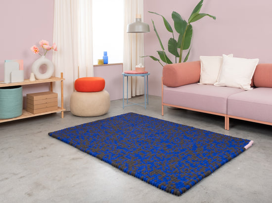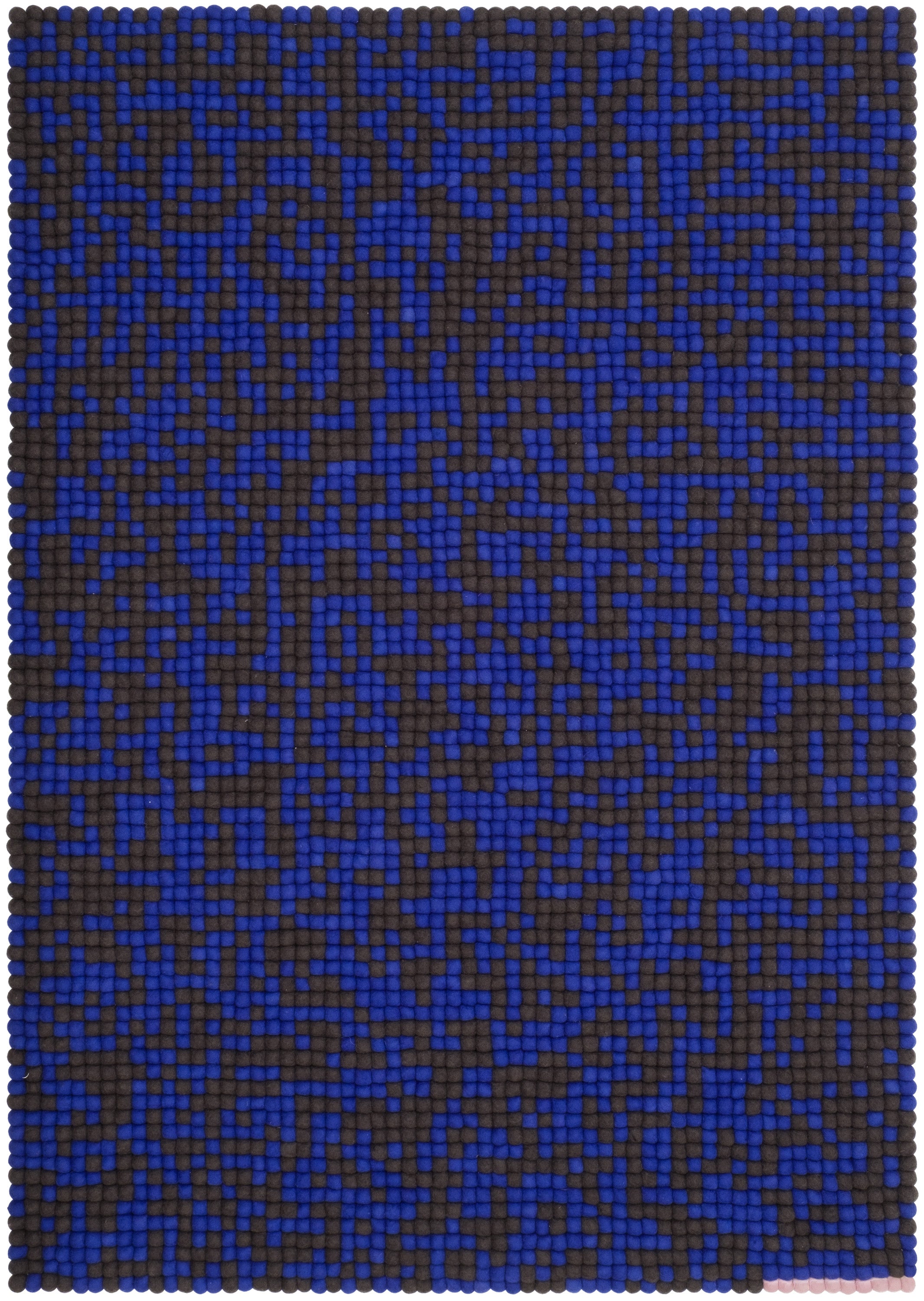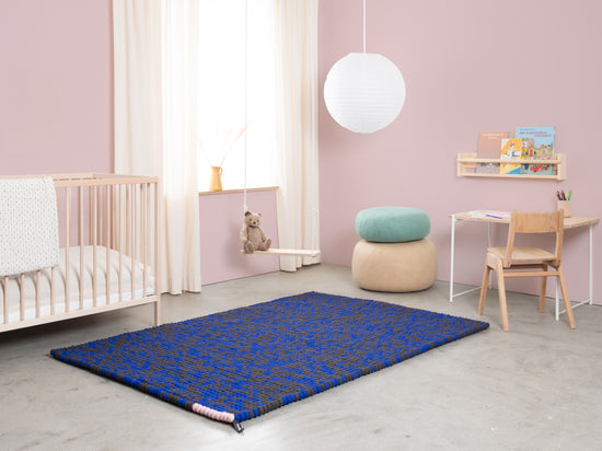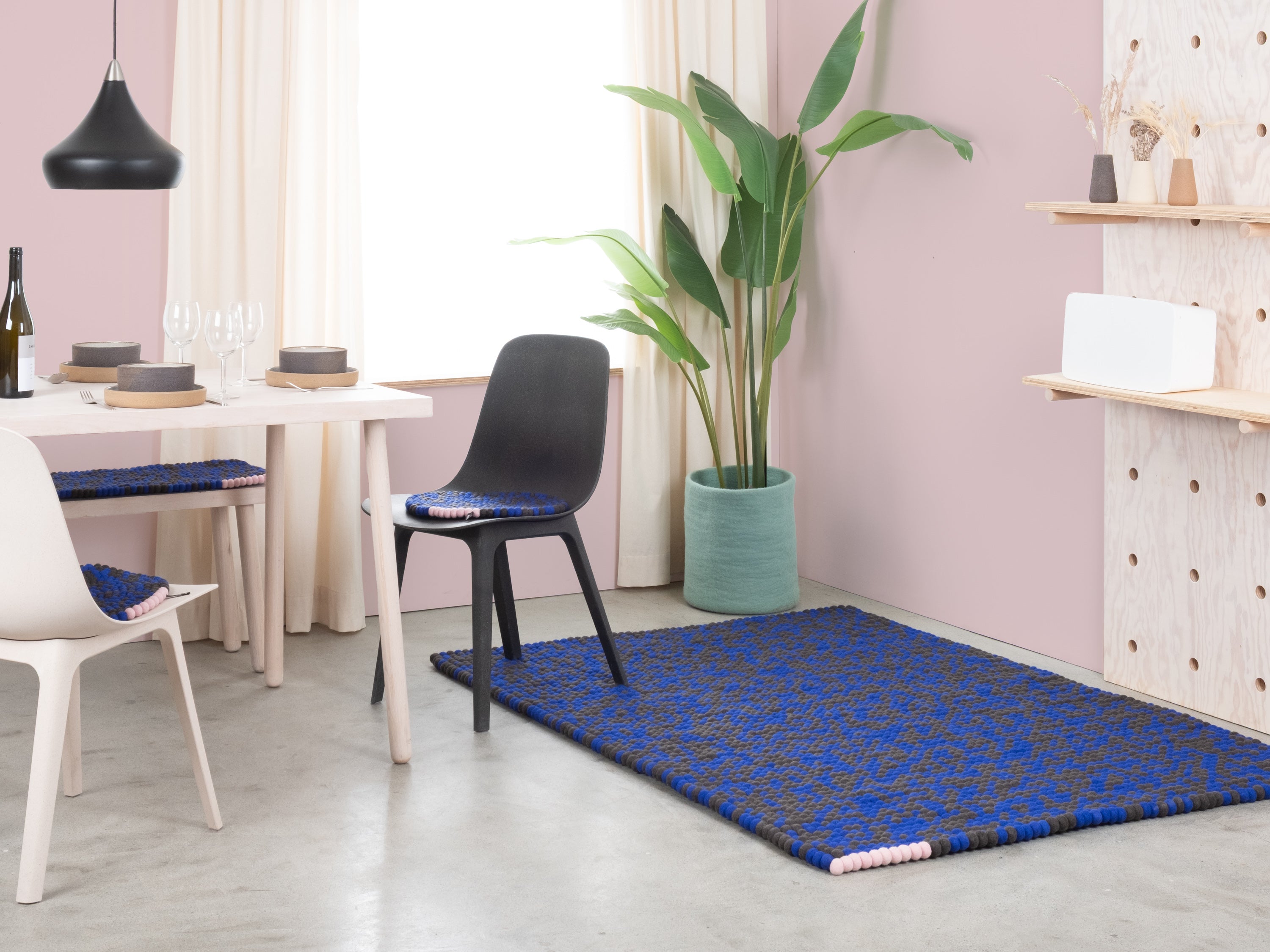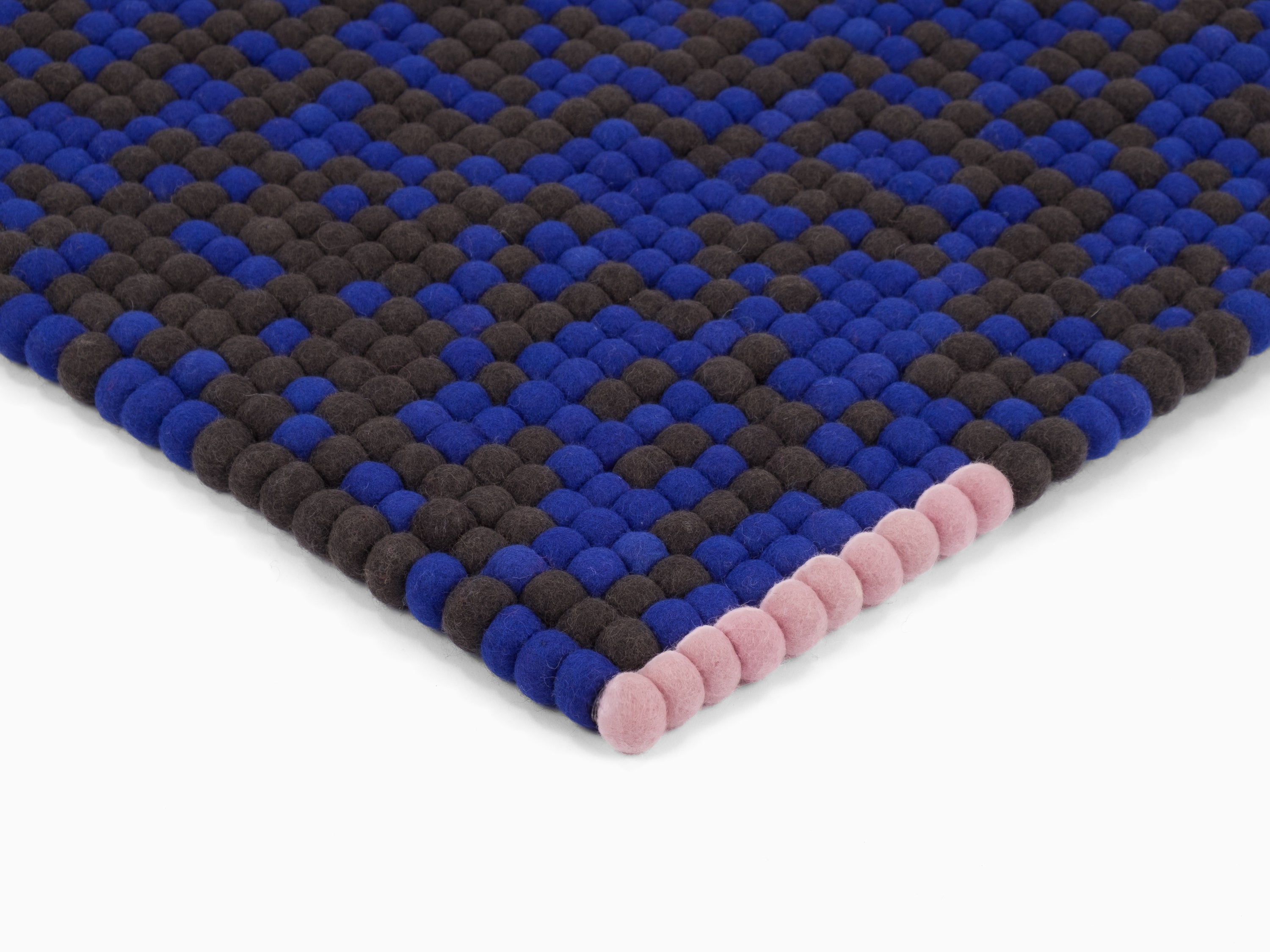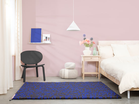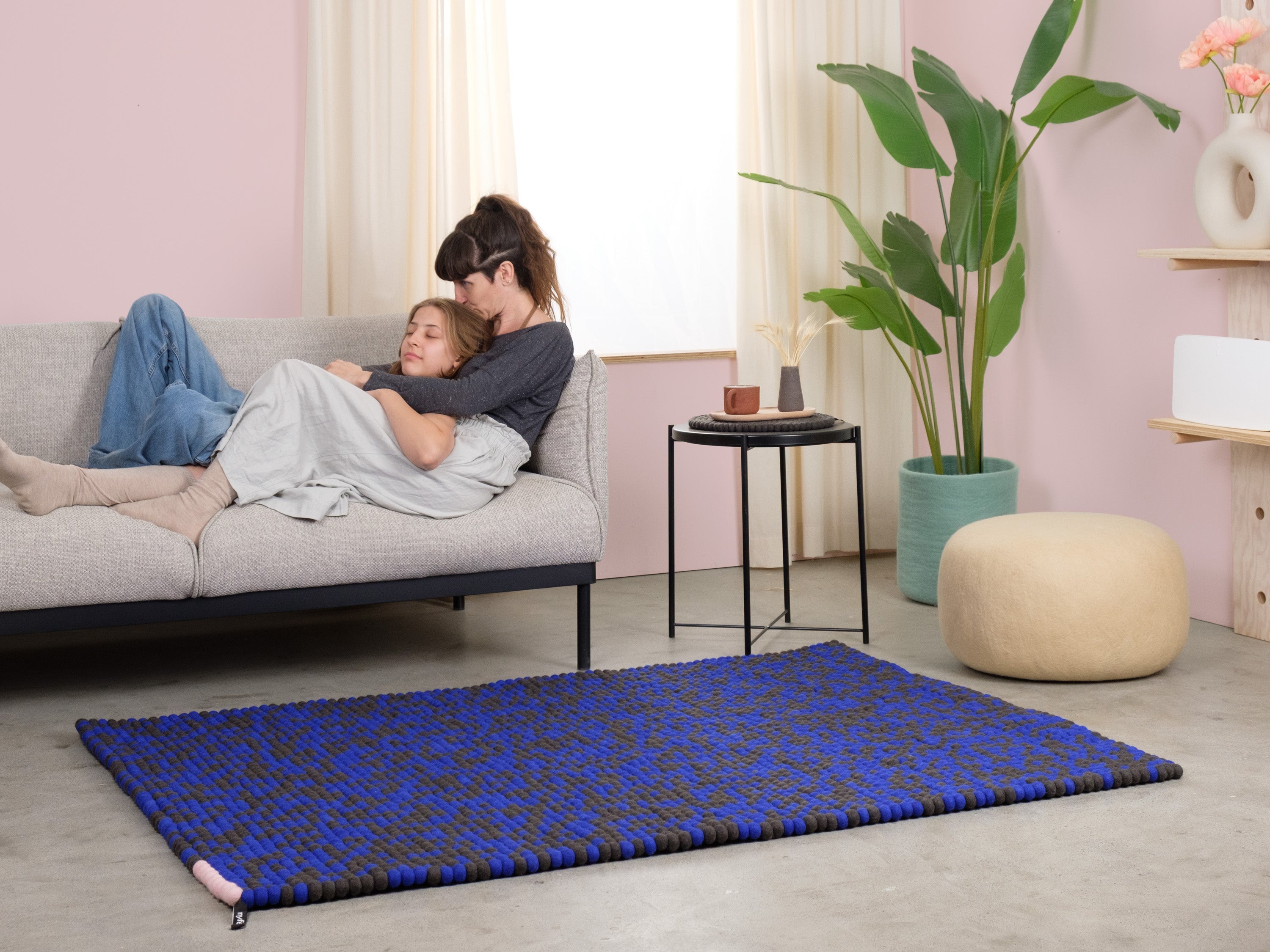 Cobalt blue and graphite: deep, focused, calm. A felt ball rug that grounds the room and makes colors shine. Easy-care, temperature-balancing, and long-lasting – Nepalese craftsmanship in precise structure.