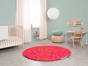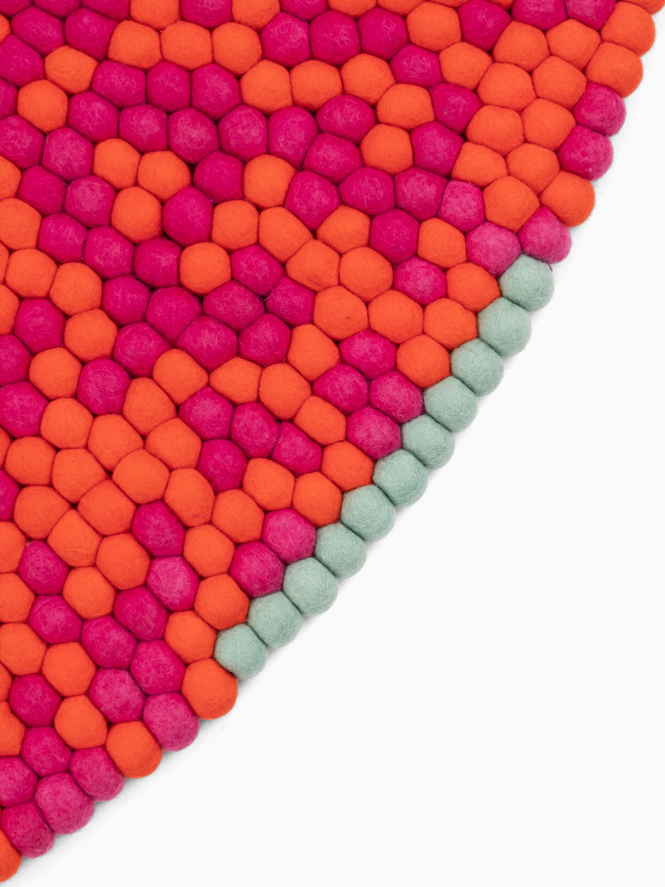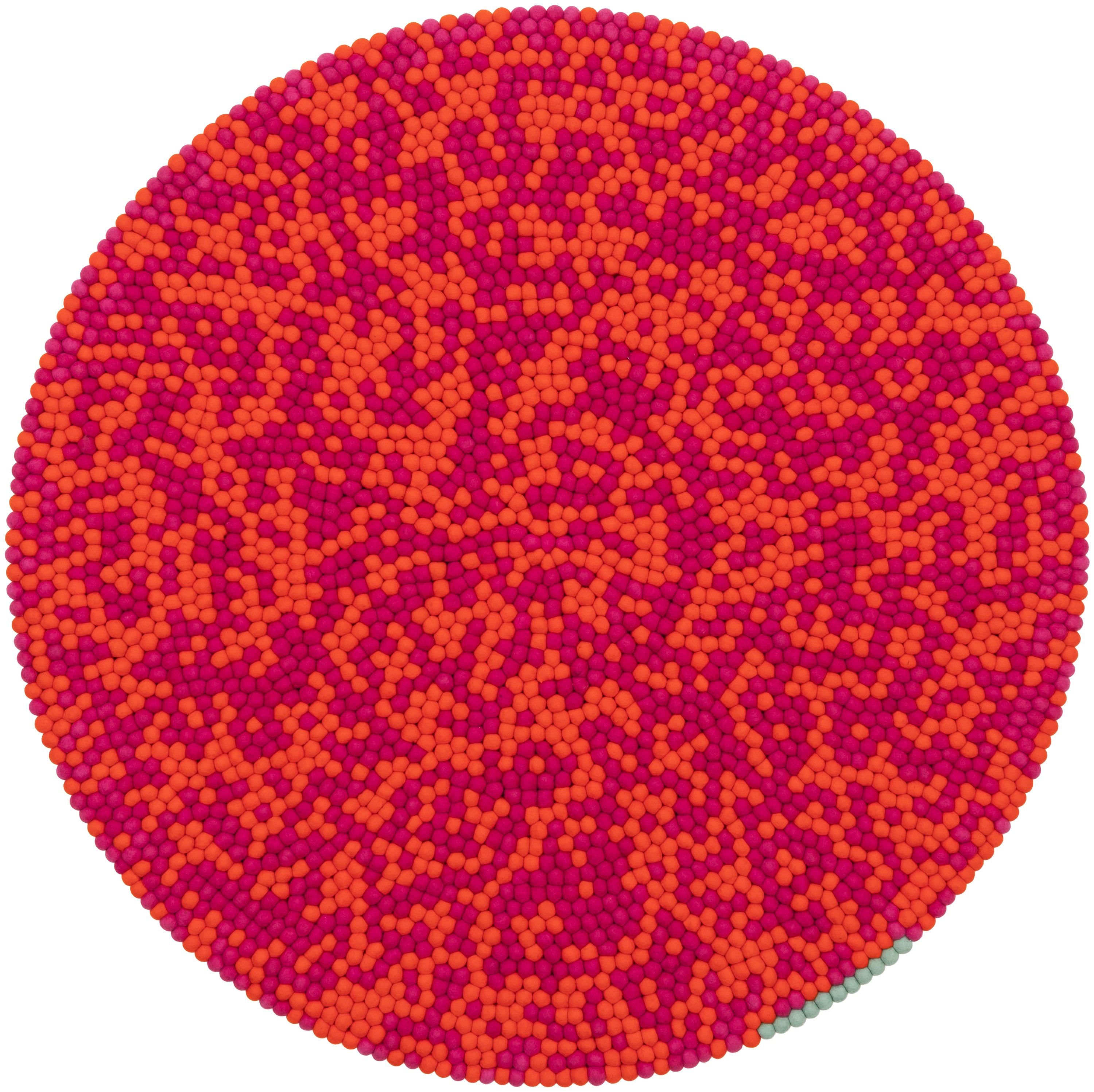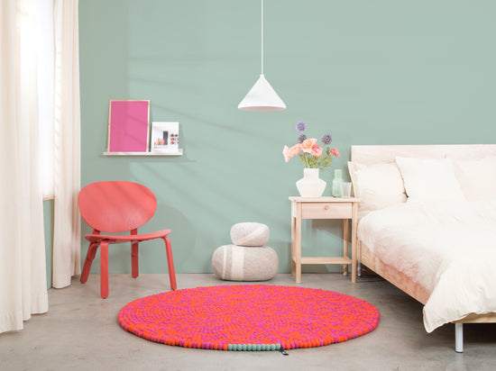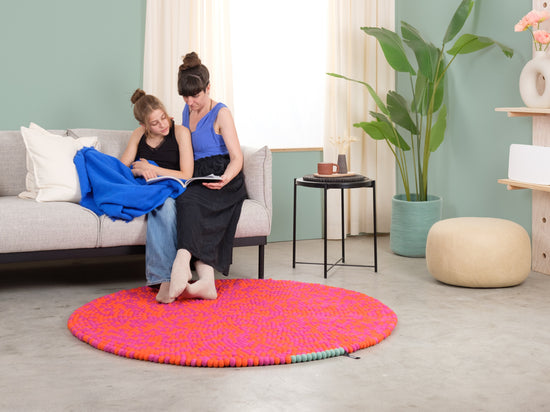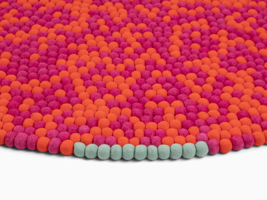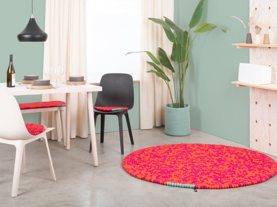 Magma orange and fuchsia: vibrating in interplay. Warm. Full of energy. A felt ball rug that brings rooms to life. Tangible texture, durable, and naturally dirt-repellent.
