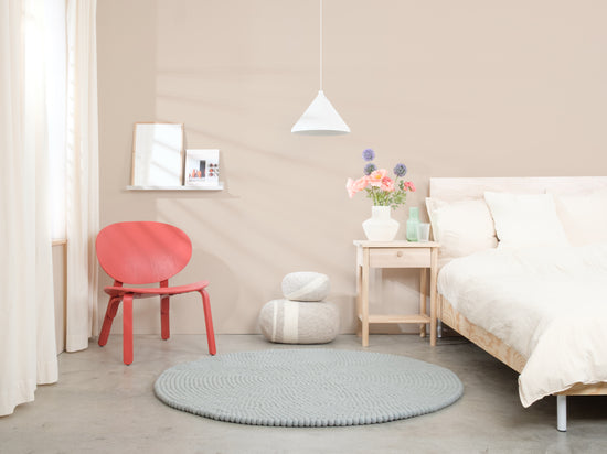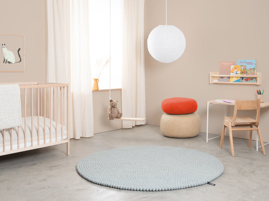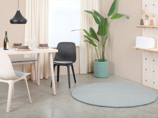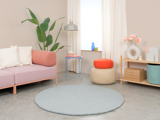 Liv is a felt ball rug in a cool light blue. It brings clarity and lightness and makes small rooms feel larger. Pairs with white, oak and neutral tones—either as a calm base or a fresh accent. Soft, sound-dampening and naturally dirt-repellent. Handcrafted in Nepal from 100% pure new wool.