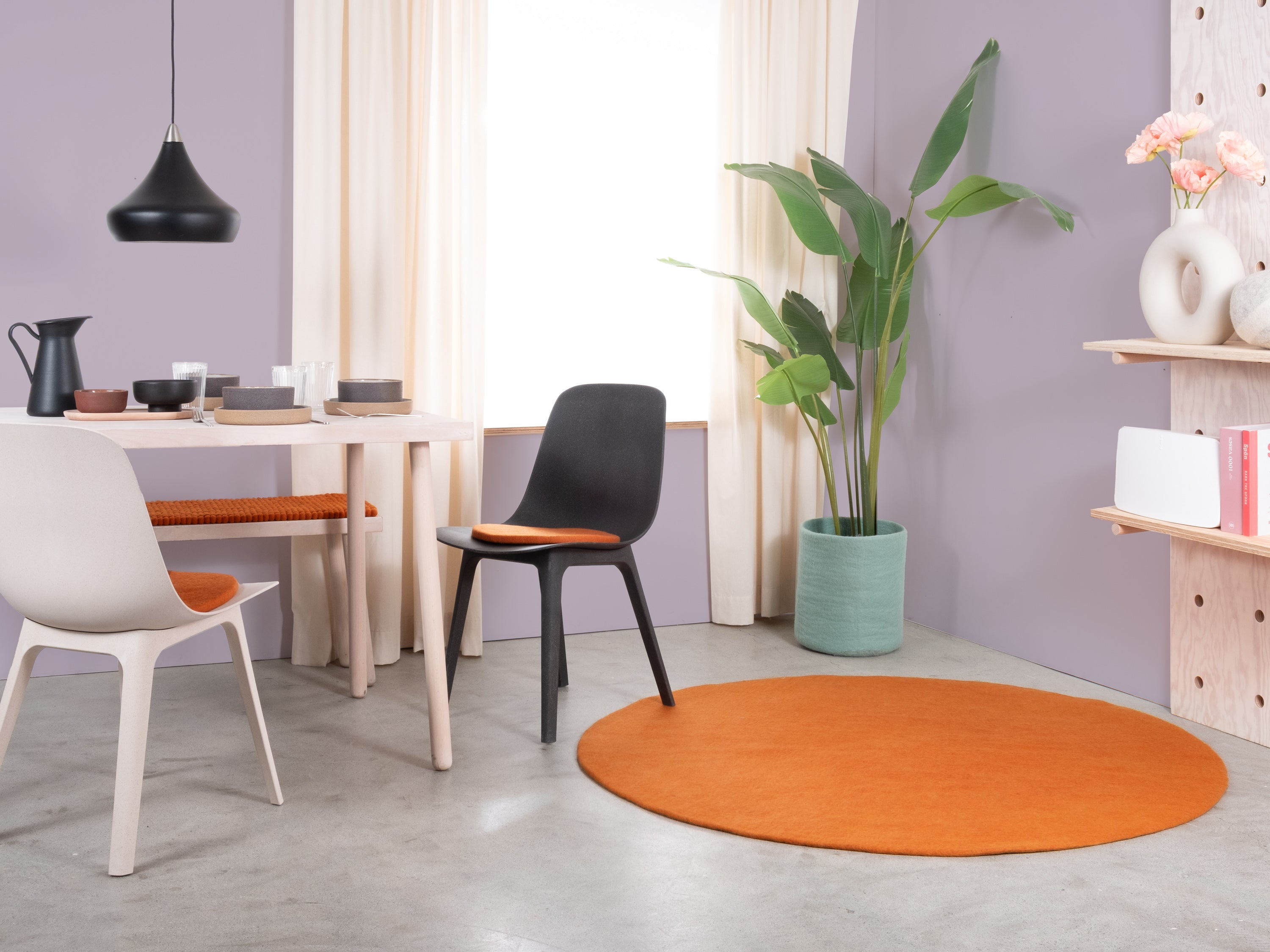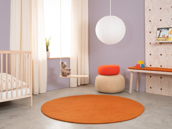 Afra adds a warm orange to the room. Inviting and energising without being loud. Perfect for warming cooler spaces or adding accents. Robust, easy-care and pleasant underfoot. Handcrafted in Nepal—100% pure new wool.