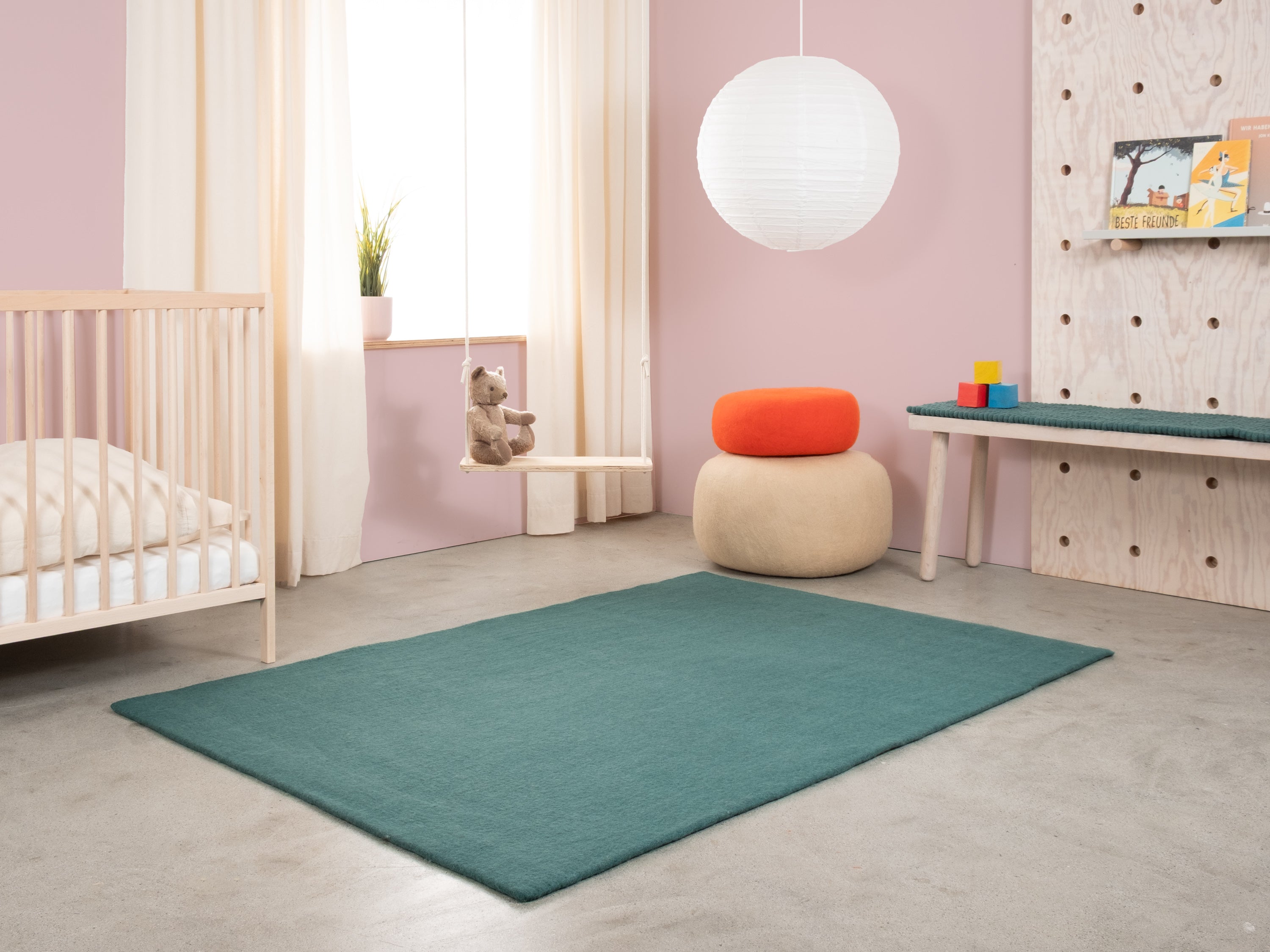Noah is a felt rug in deep petrol. Powerful, clear, and yet calming – as a statement piece or a quiet base. It pairs well with light wood, concrete, and neutral colours. Noticeably soft, durable, and easy to care for. Handmade in Nepal from 100% pure new wool.