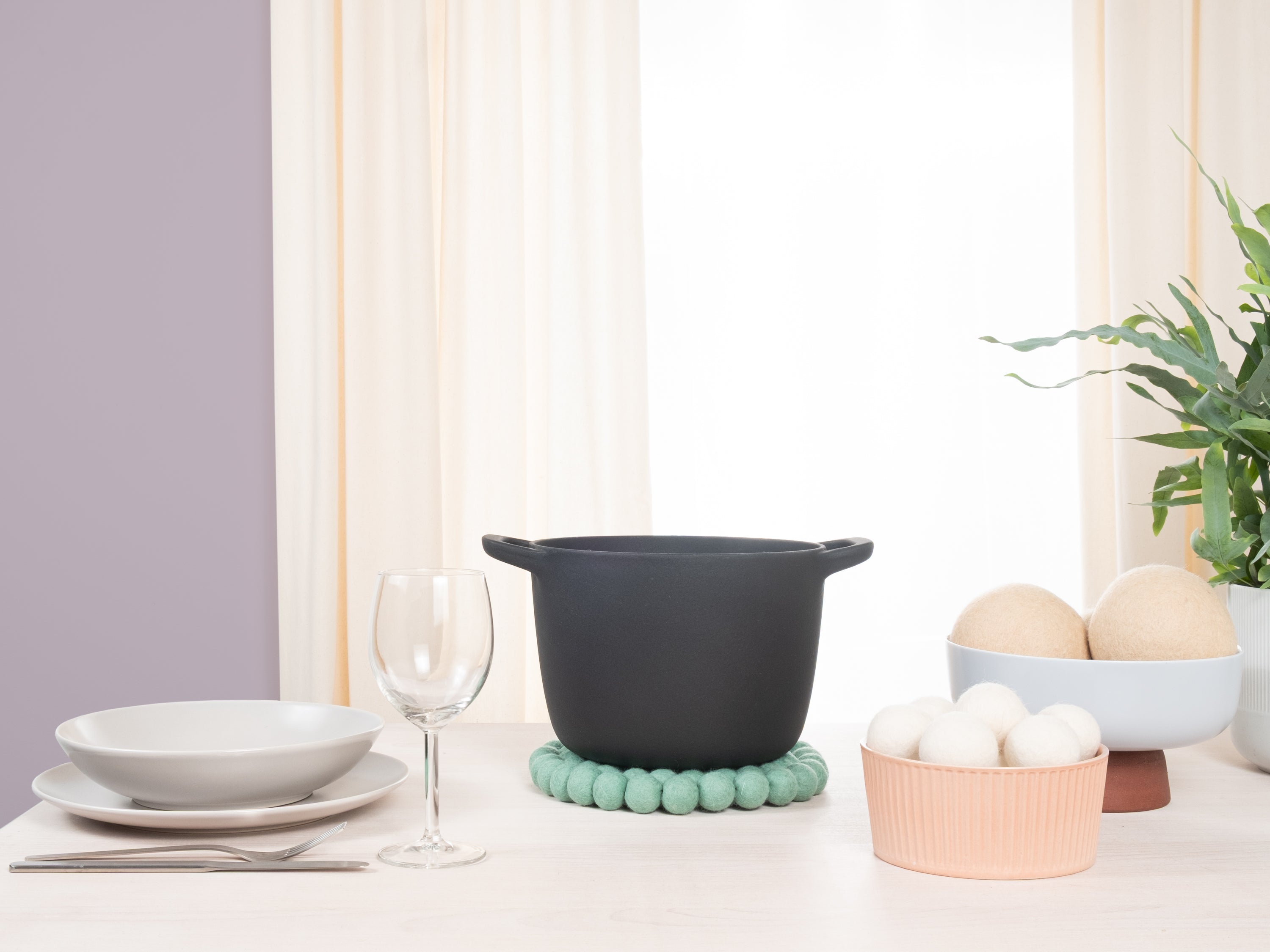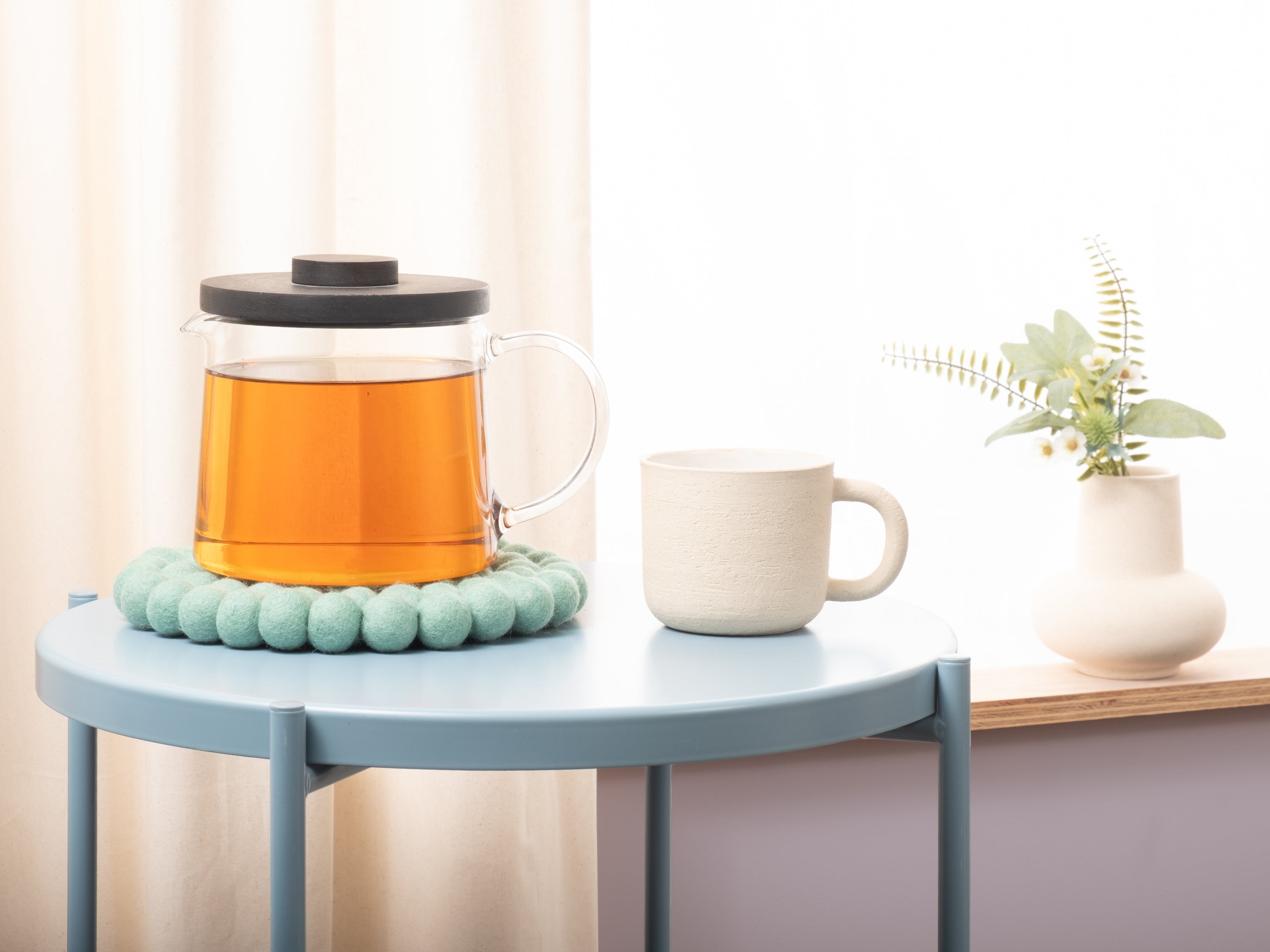 The trivet Fine in the colour turquoise combines functionality with charming design. Robust, heat-resistant, water- and dirt-repellent, and reversible. Made from pure new wool, handcrafted in Nepal under fair conditions.