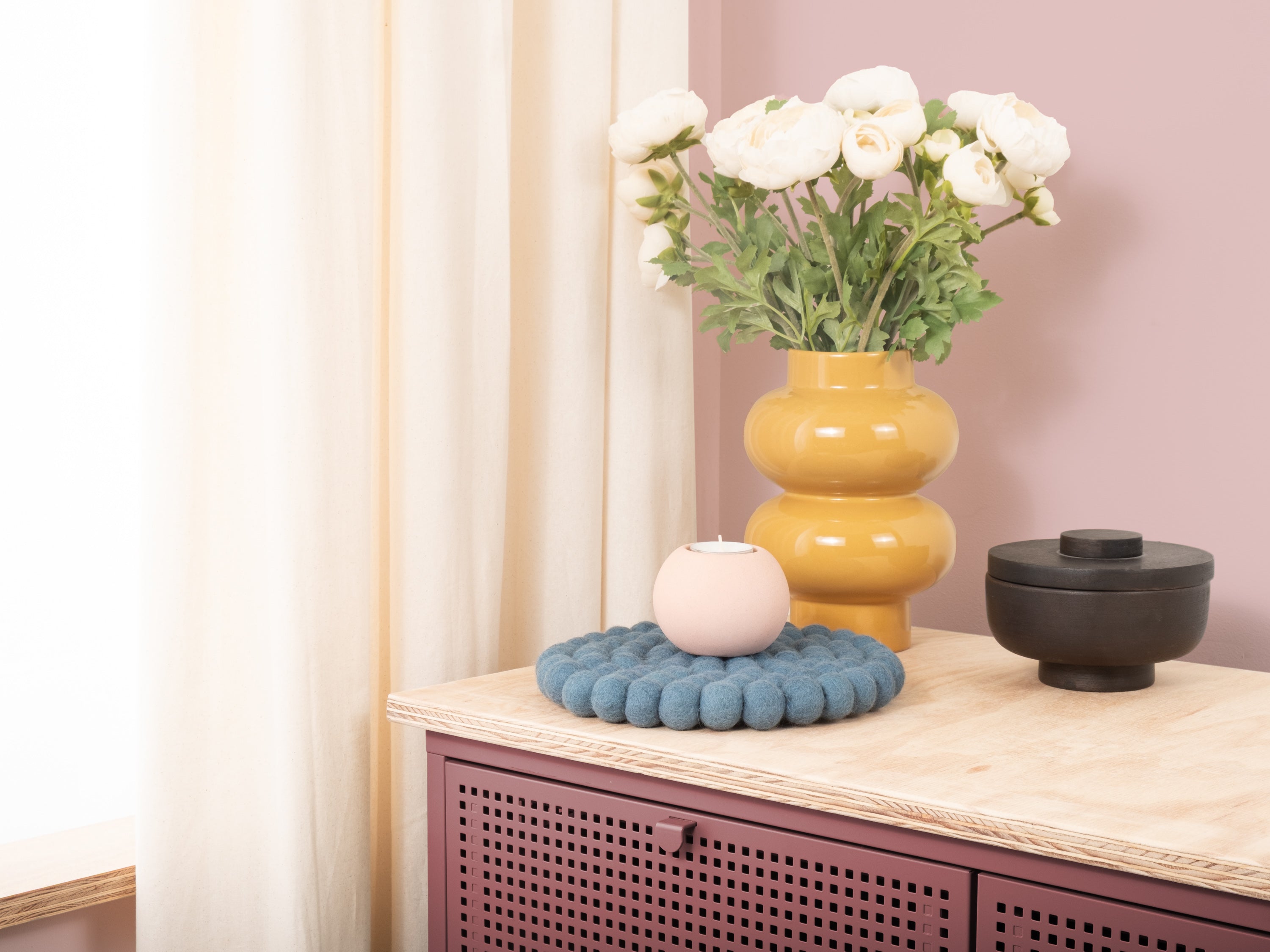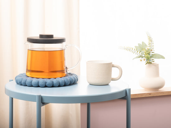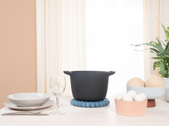 The trivet Nilo in the colour blue combines functionality with charming design. Robust, heat-resistant, water- and dirt-repellent, and reversible. Made from pure new wool, handcrafted in Nepal under fair conditions.