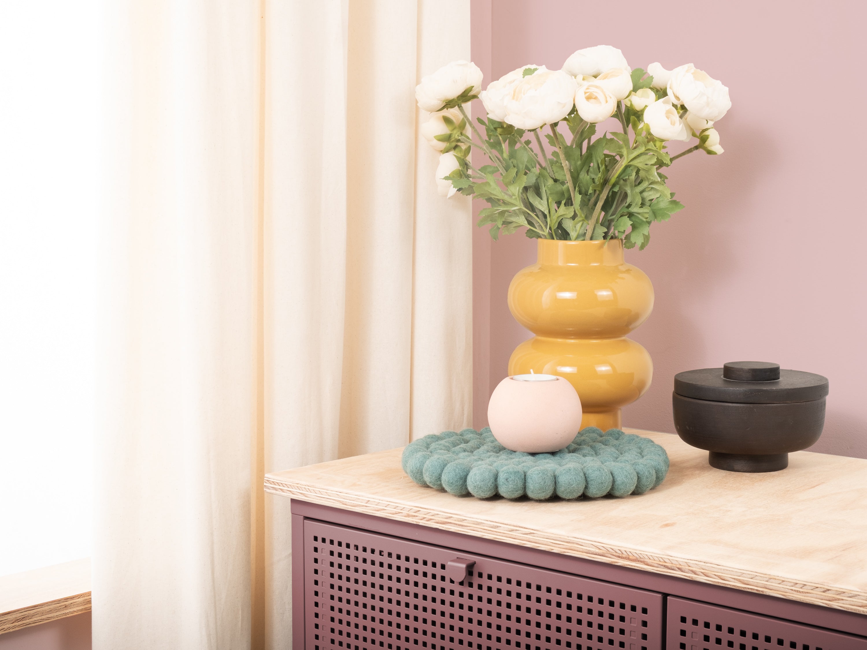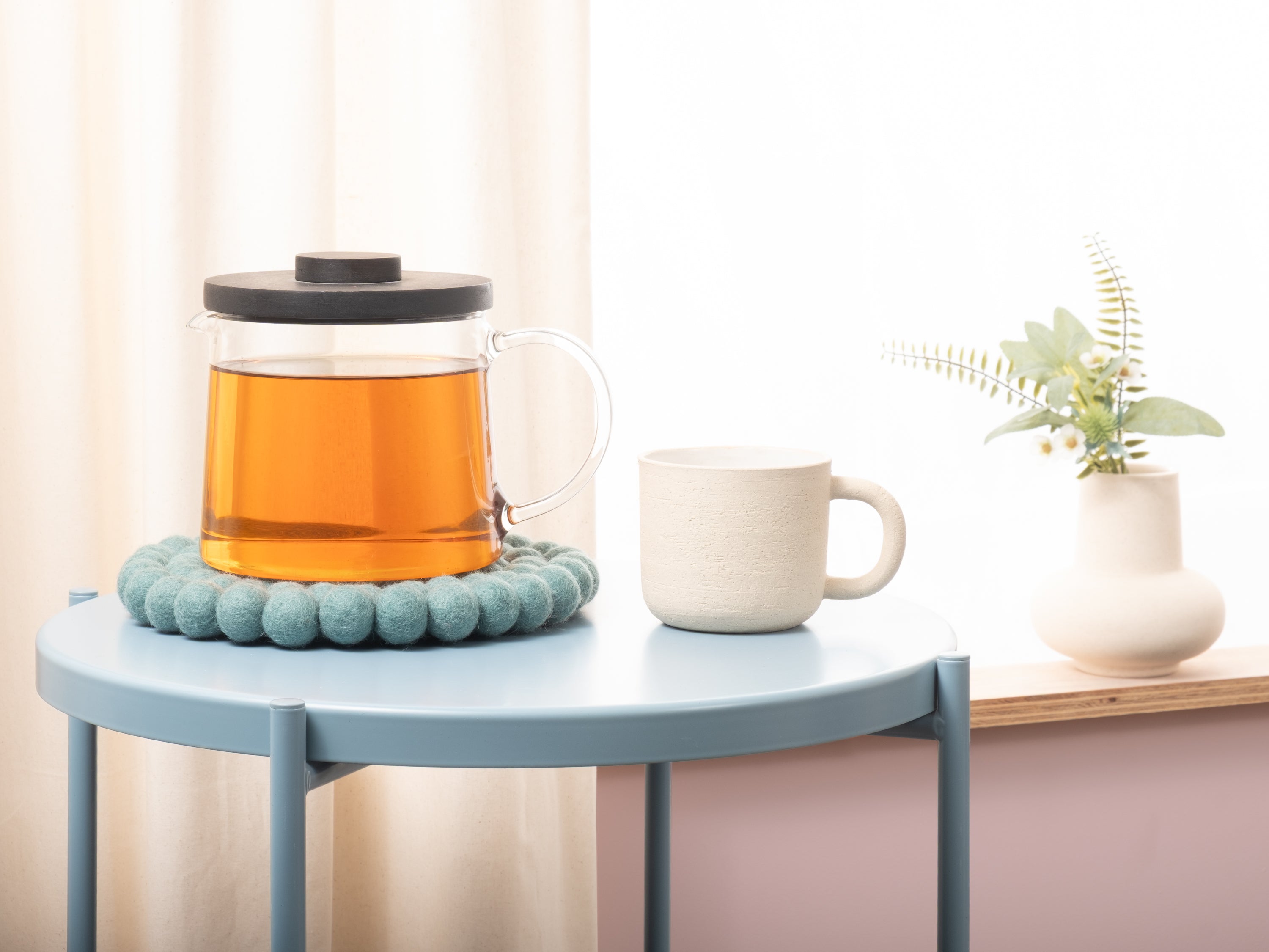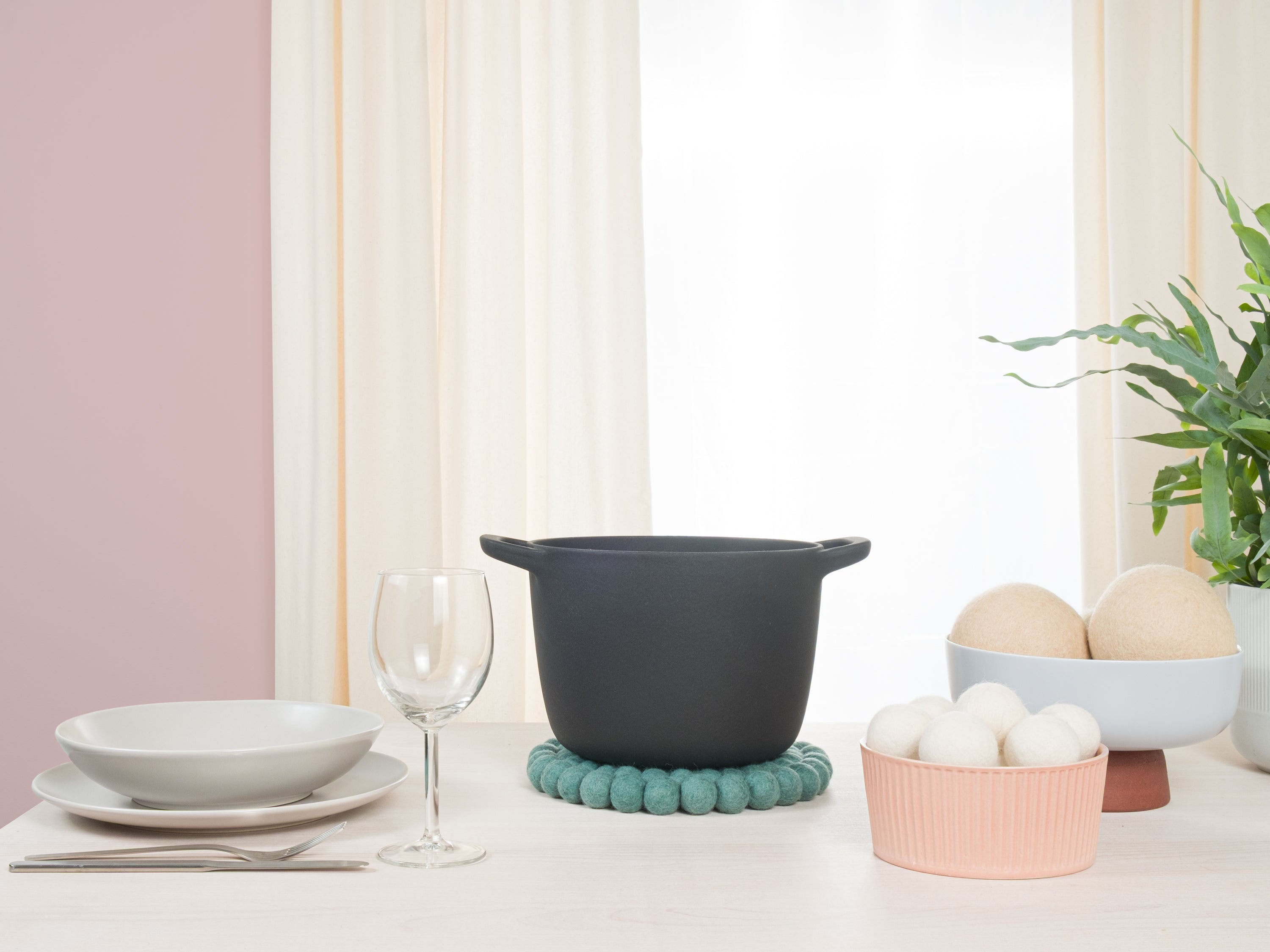 The trivet Taro in the colour aqua combines functionality with charming design. Robust, heat-resistant, water- and dirt-repellent, and reversible. Made from pure new wool, handcrafted in Nepal under fair conditions.