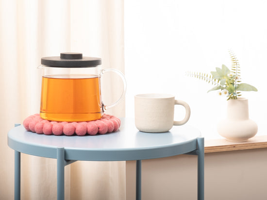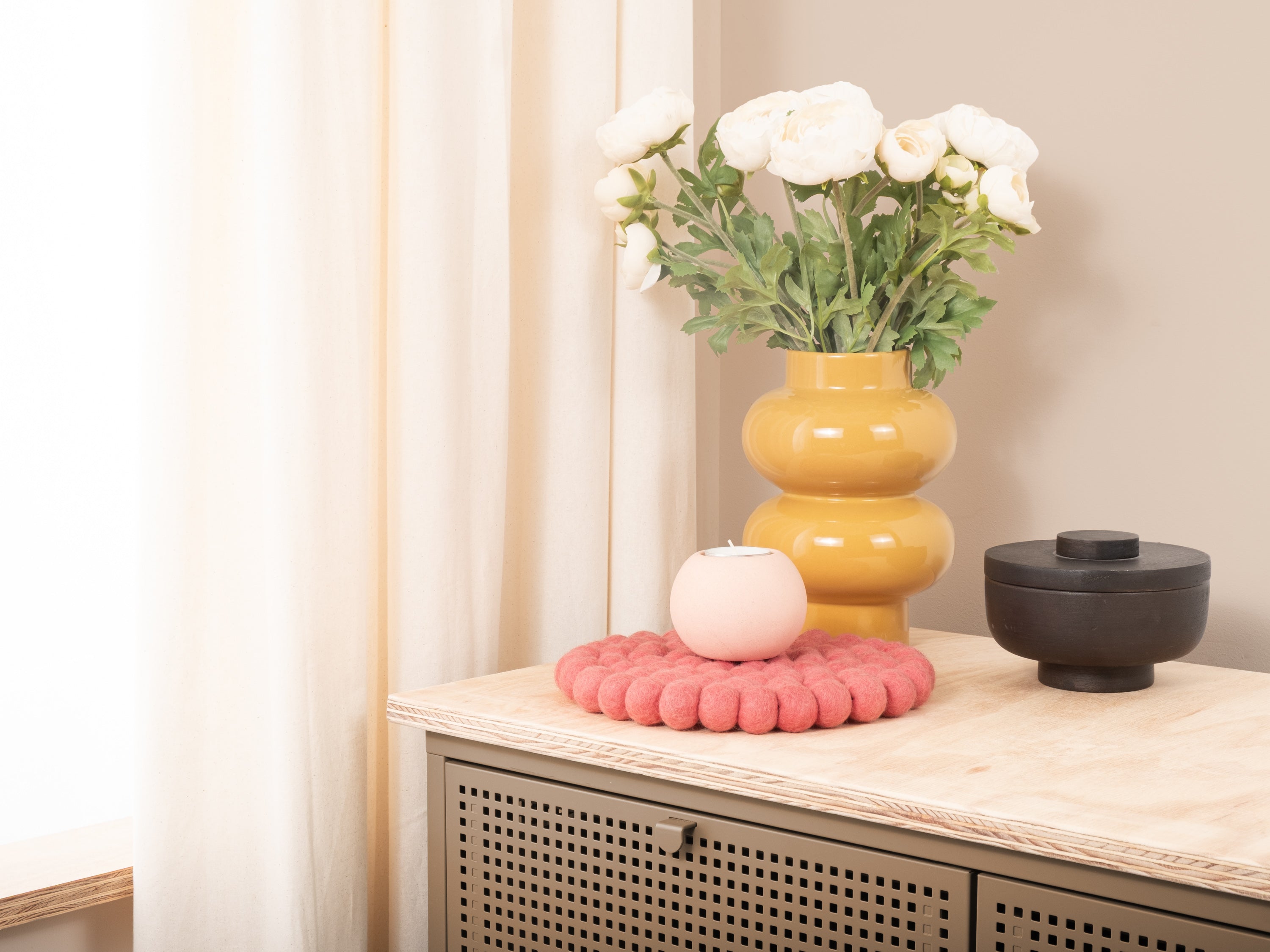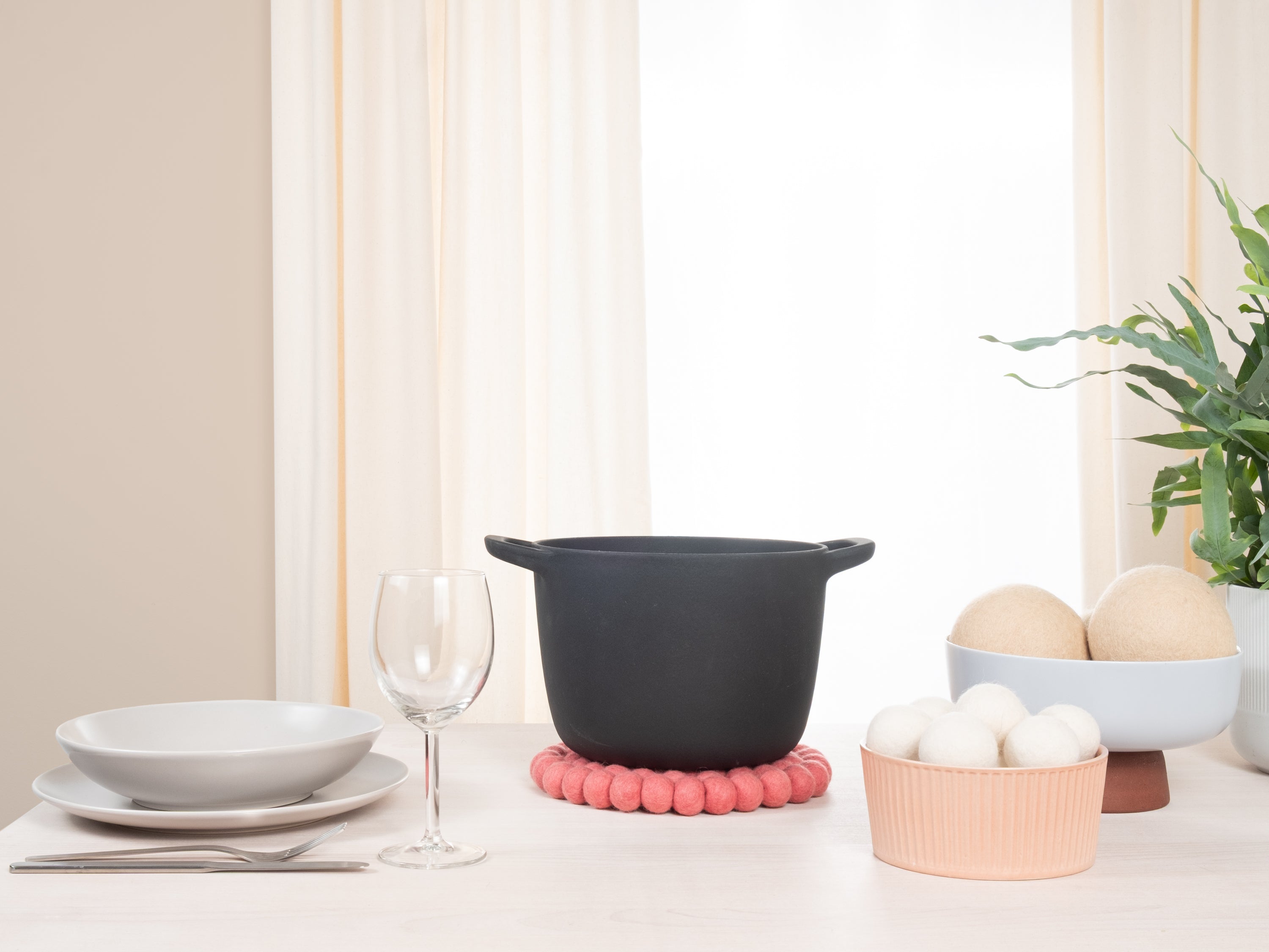 The trivet Vera in the colour coral pink combines functionality with charming design. Robust, heat-resistant, water- and dirt-repellent, and reversible. Made from pure new wool, handcrafted in Nepal under fair conditions.